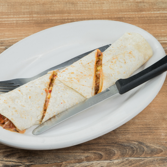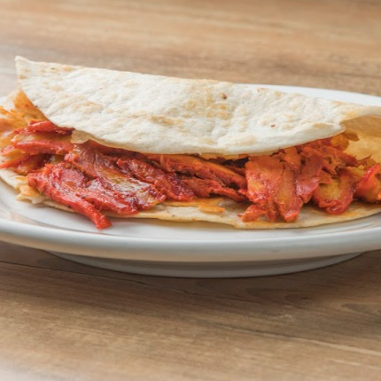Son dos tortillas de harina enrollados con queso, cebolla asada y proteína, 140 g.