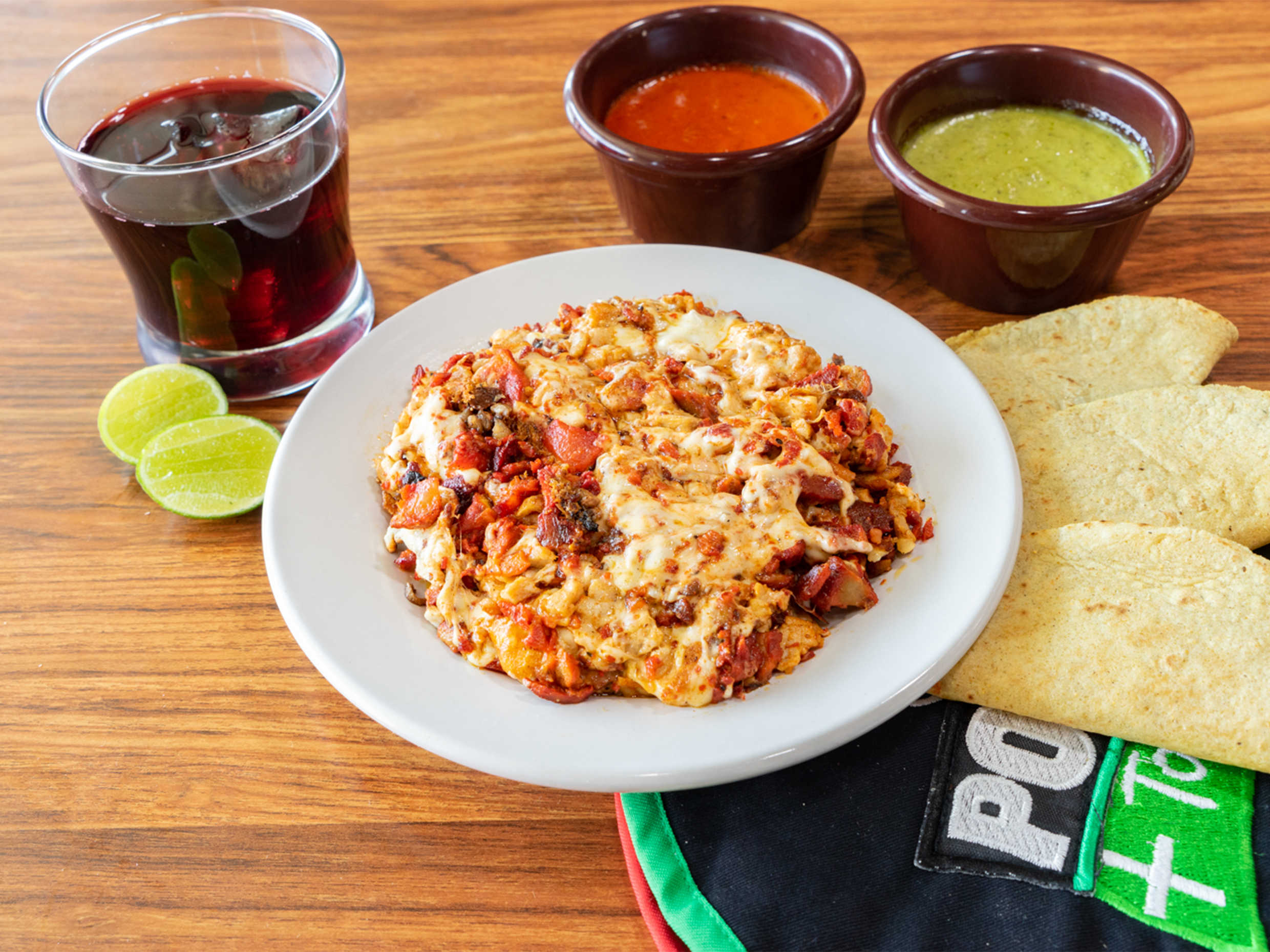 Queso fundido acompañado de tu proteína favorita, incluyen 4 tortillas de harina.