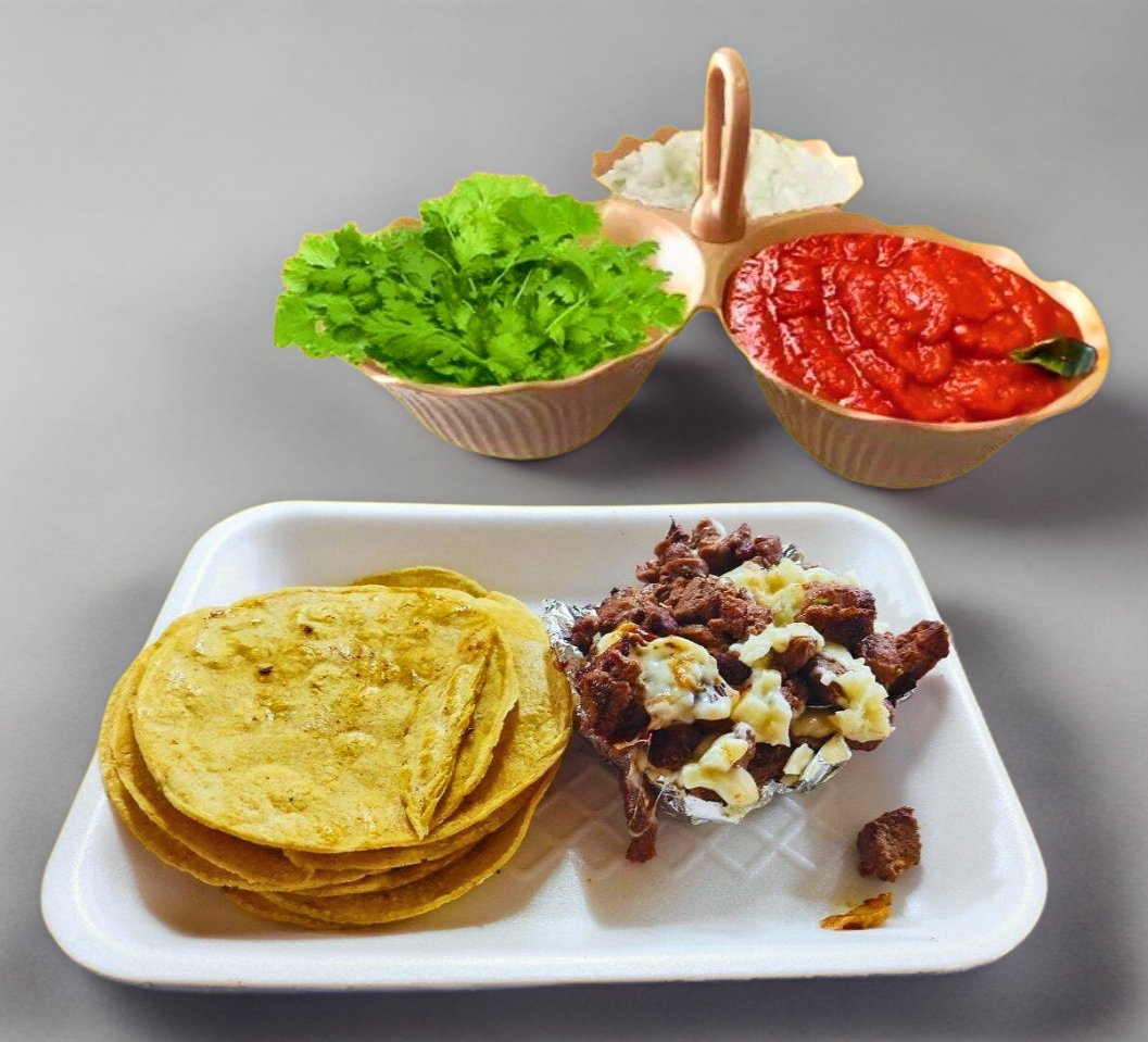 Carne de arrachera, acompañado con 10 piezas de tortillas, salsas y verduras. Plato personal