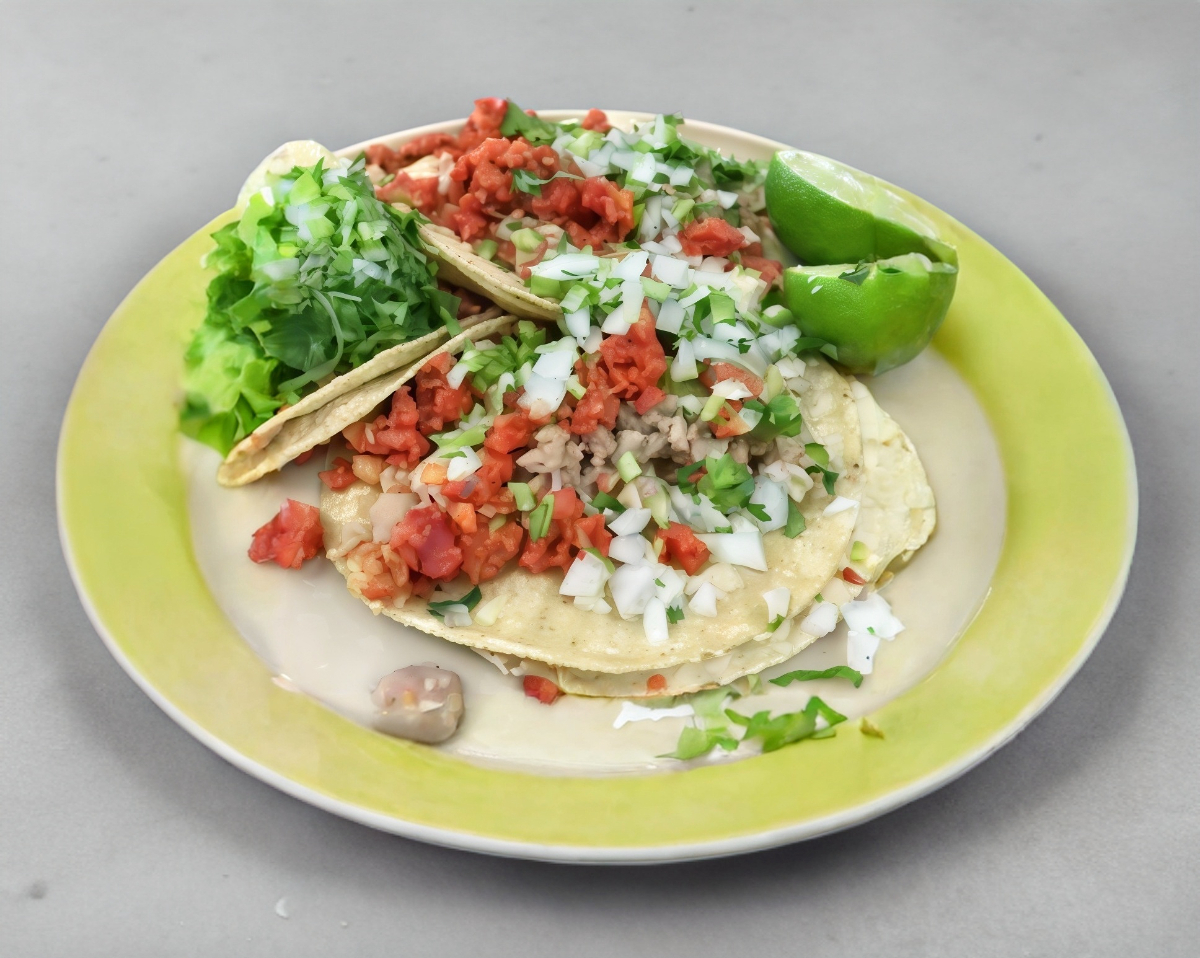 Tacos de bistec, de res, bien servidos con verdura aparte.