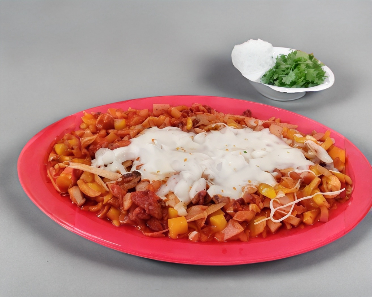 Pollo con queso, jitomate, cebolla, aguacate.