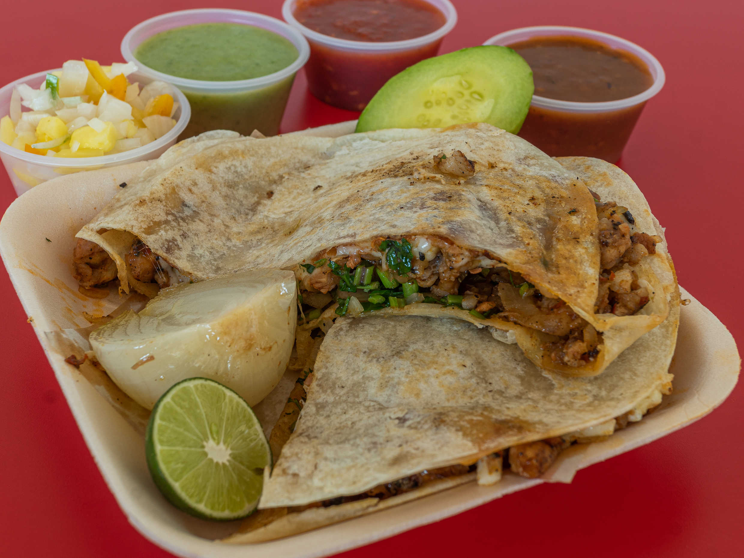 2 tortillas de harina con queso oaxaca, carne, cebolla y cilantro