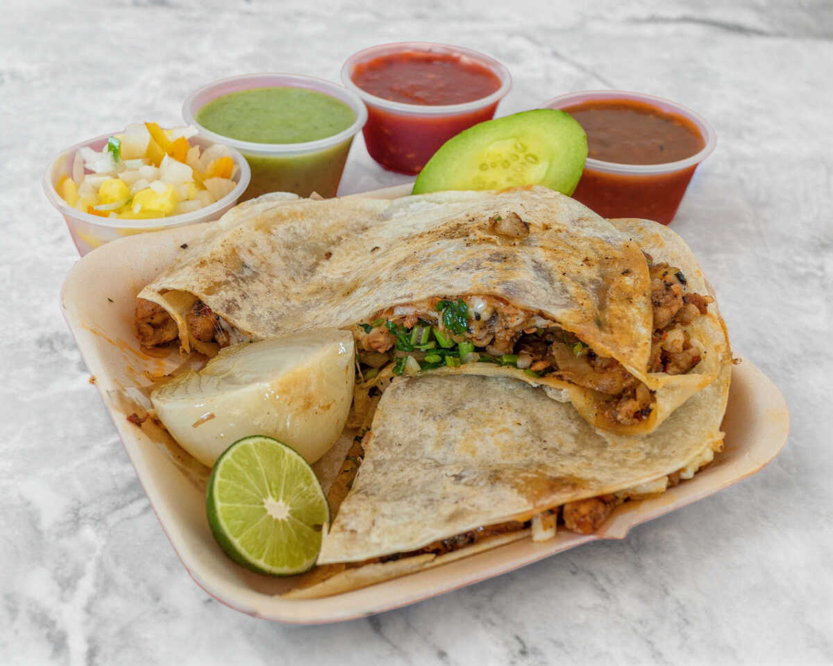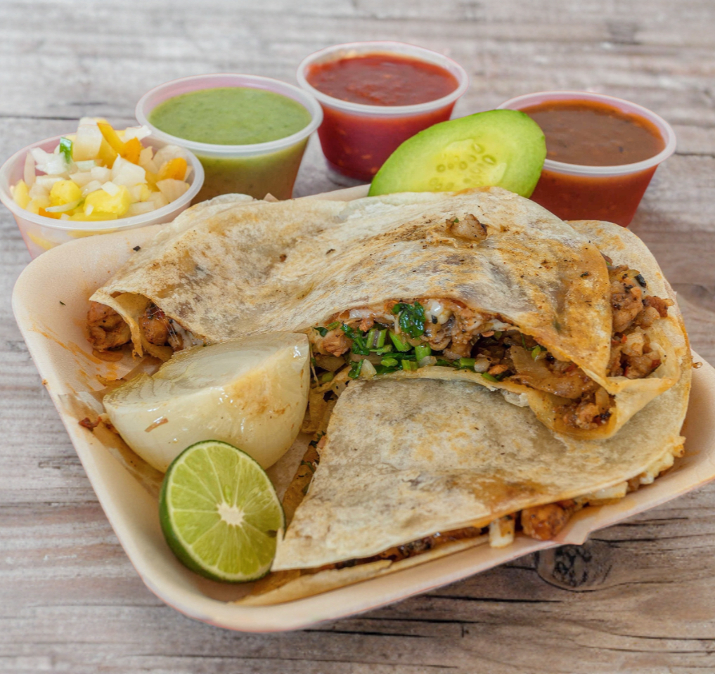 2 tortillas de harina con queso oaxaca, carne (bistec y chorizo), cebolla y cilantro