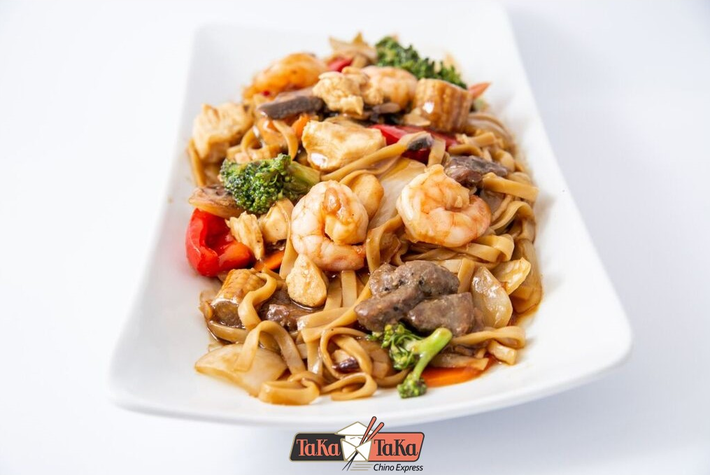 Fideos cocinado estilo Shangai,preparado con pollo,res,camarón,con verduras(jalapeño,brócoli,zanahoria,cebolla)con salsa de soja y aceite de ajonjoli