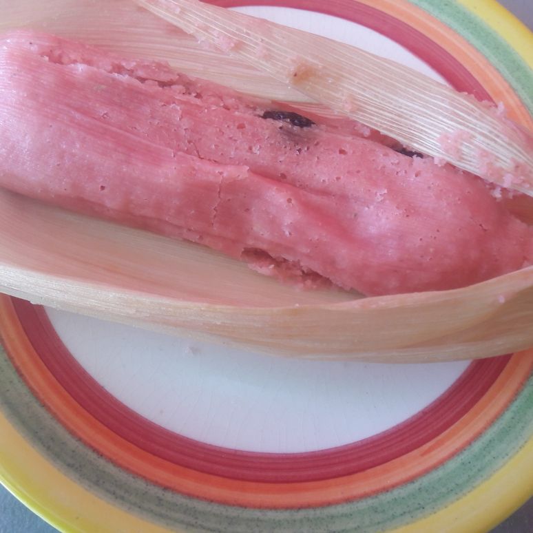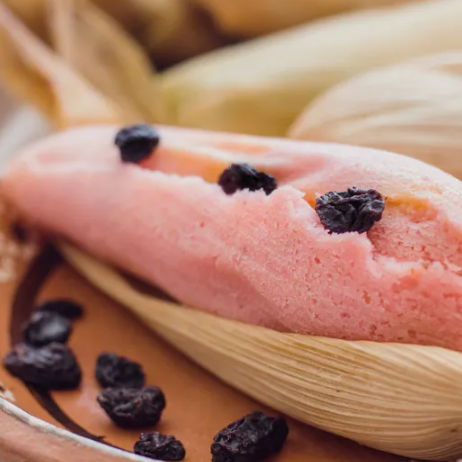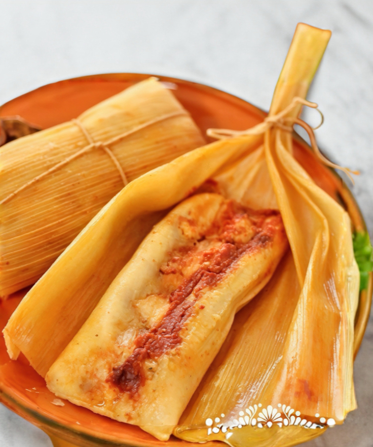 Elaborado con masa de maíz y salsa de chile guajillo, relleno de queso panela, (envuelto en hoja de maíz)