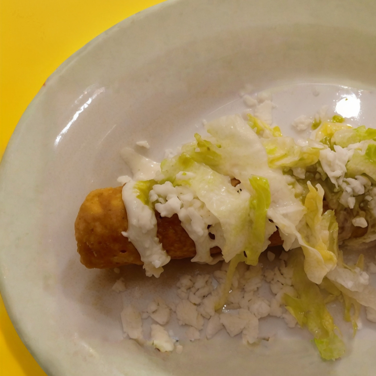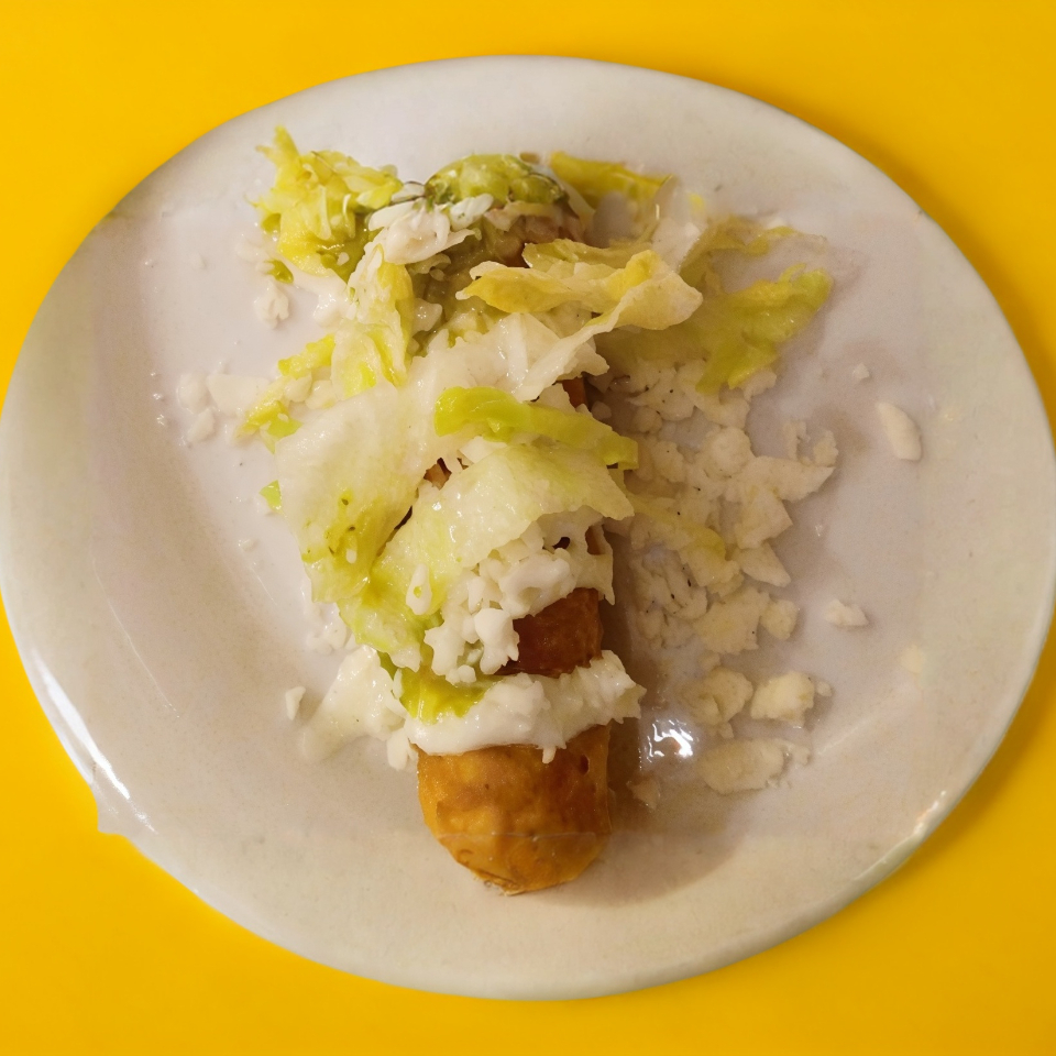 Tortilla rellena de papa acompañada de queso, crema, lechuga, cebolla y guacamole.
