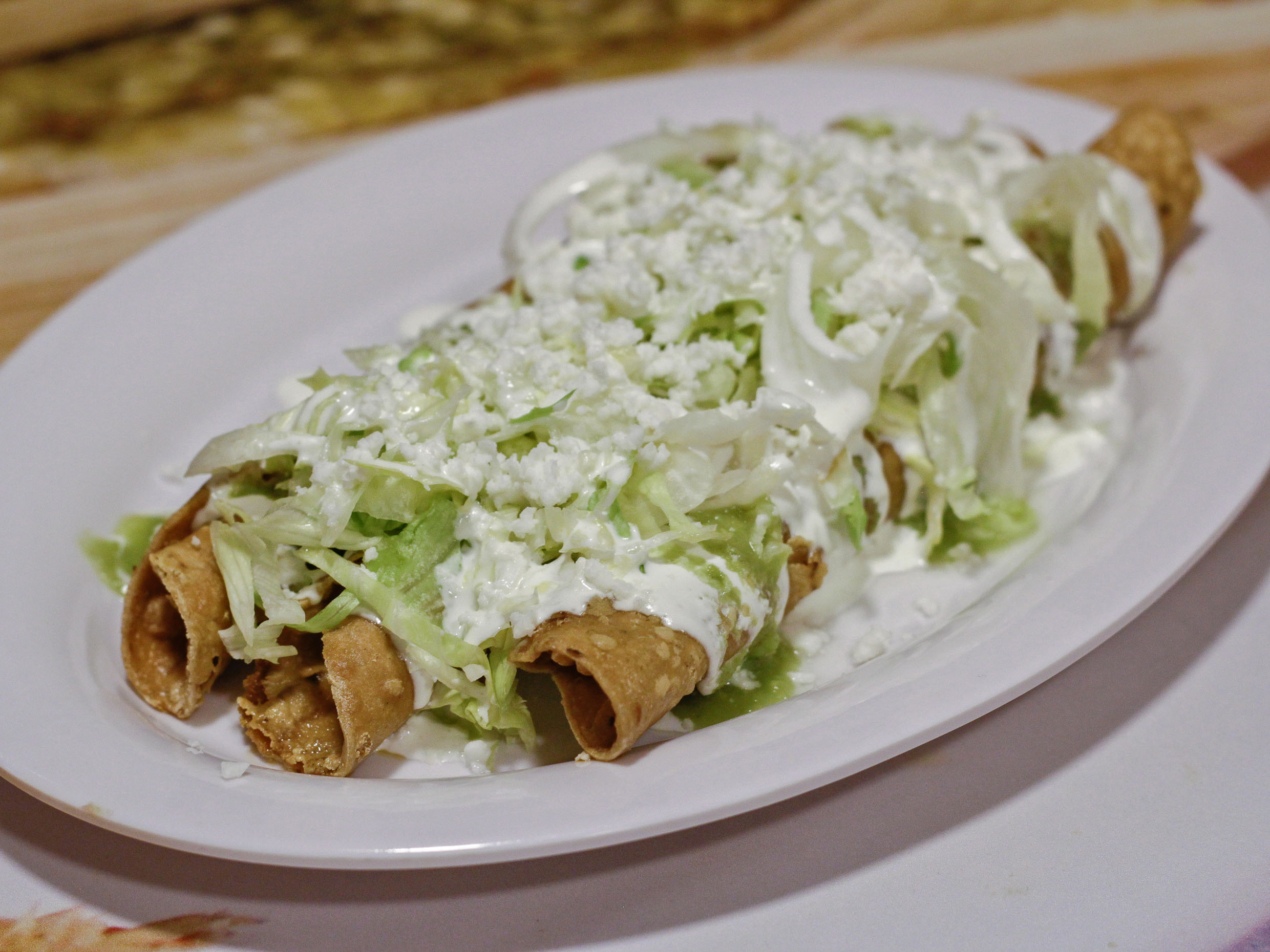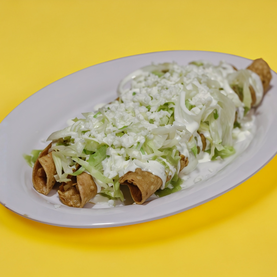 Tortilla rellena de pollo acompañada de queso, lechuga, crema, guacamole y cebolla