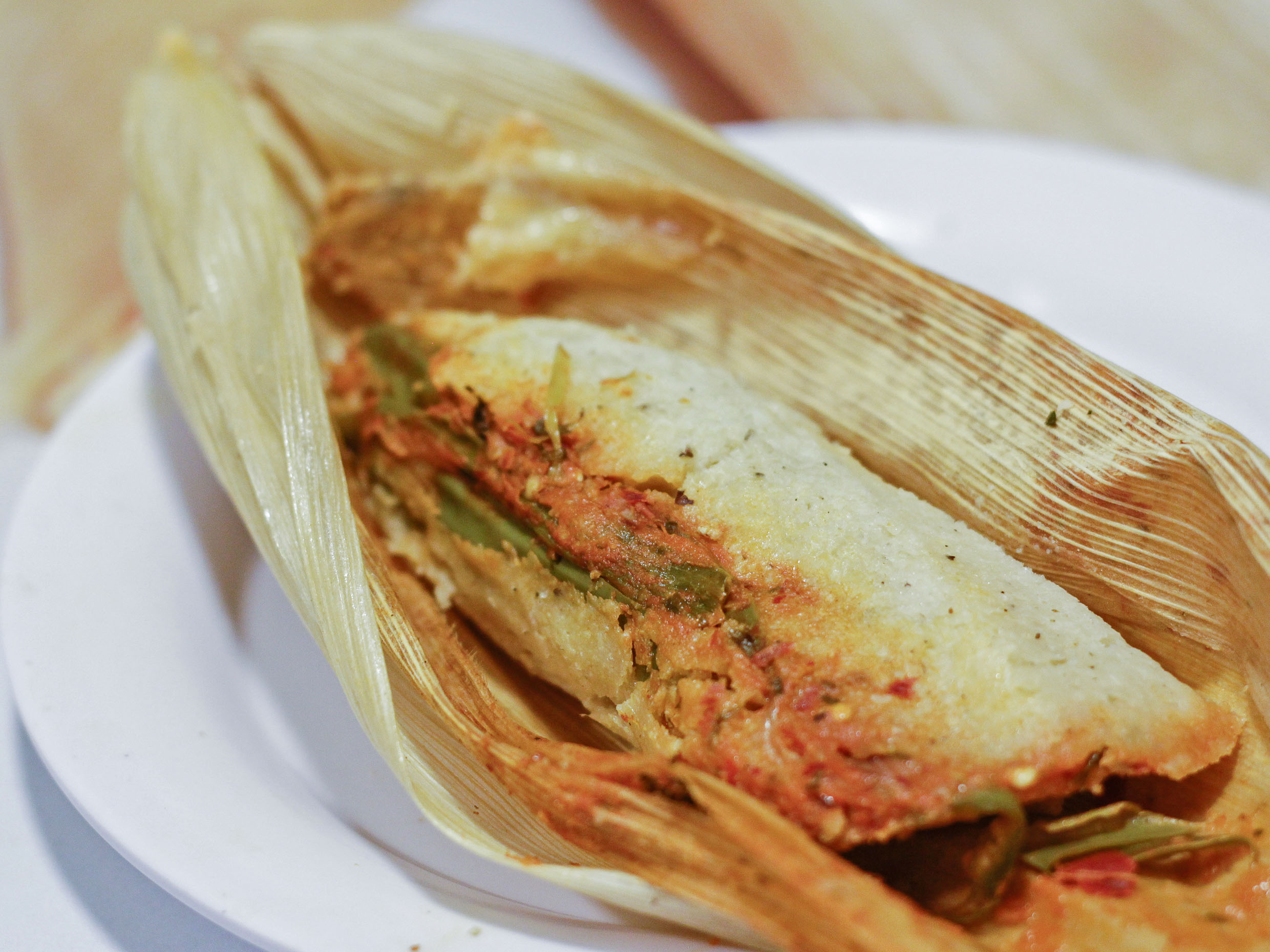 Tortilla rellena de carne de cerdo acompañada de queso, lechuga, cebolla, crema y guacamole.
