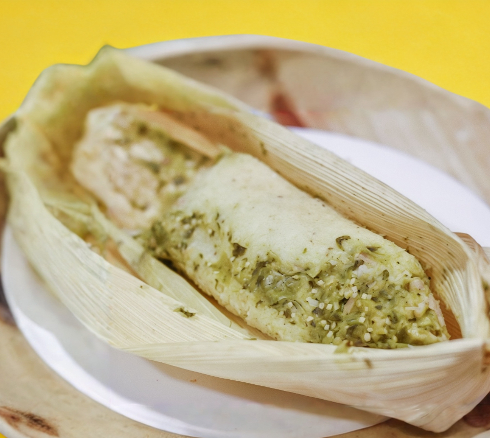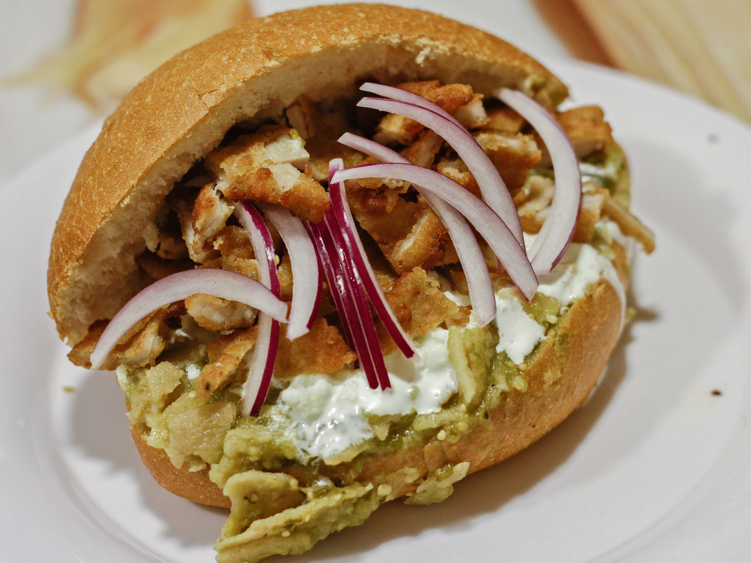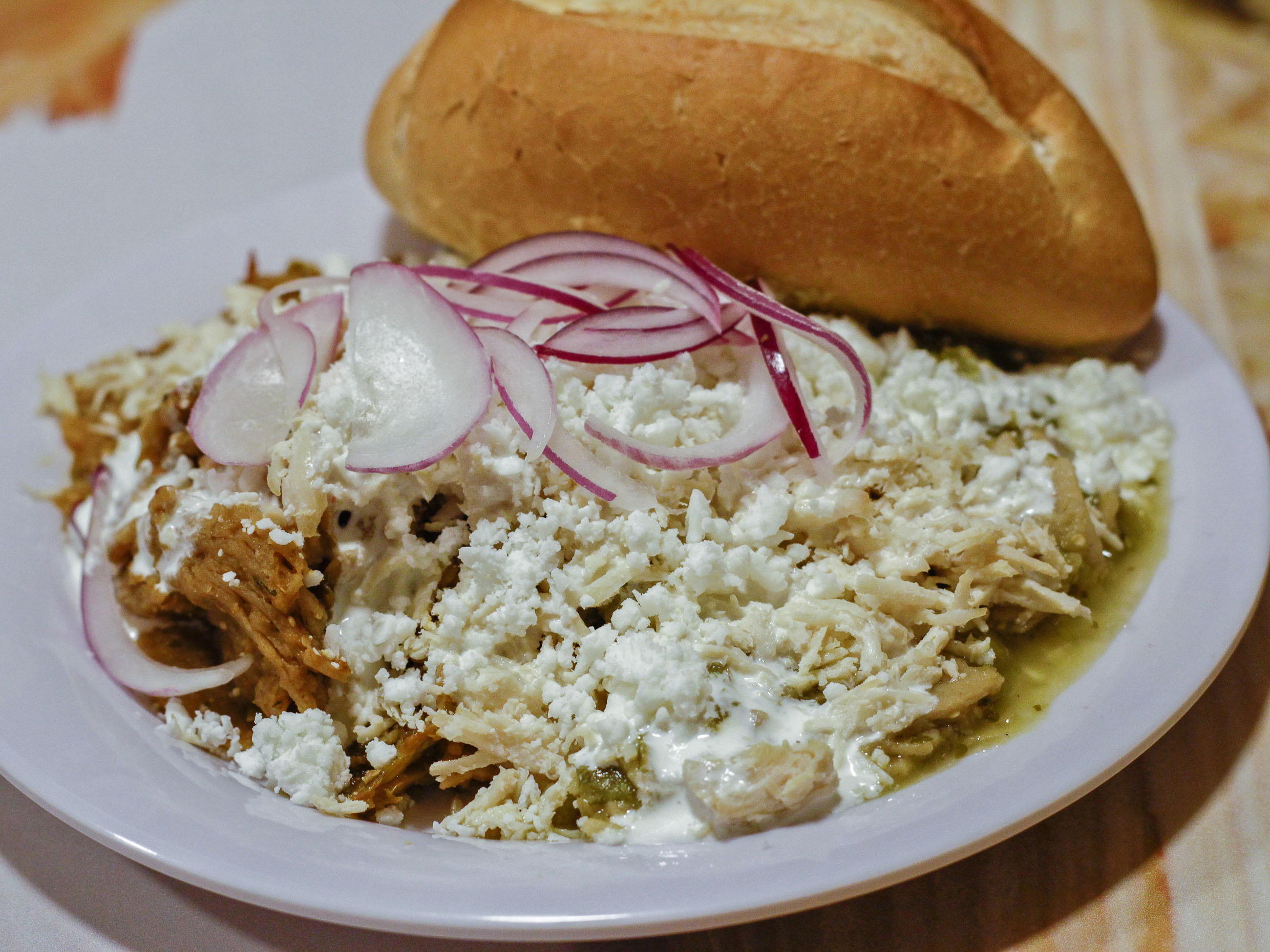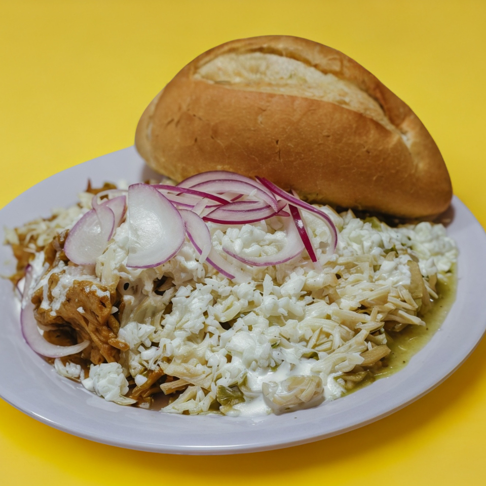 Bolillo relleno de totopos bañados en salsa a elegir, pollo, crema, queso y cebolla.