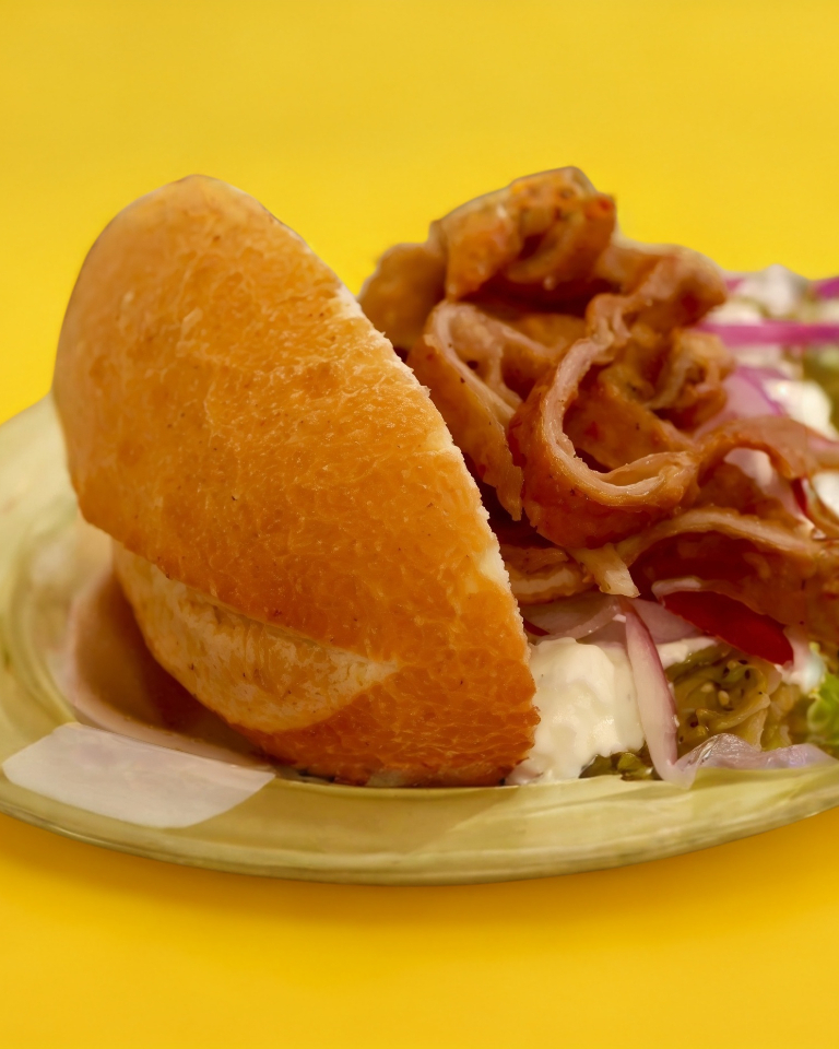 Bolillo relleno con totopos bañados en salsa a elegir, con milanesa de cerdo, crema, queso y cebolla.