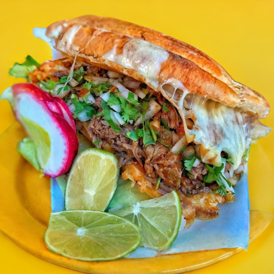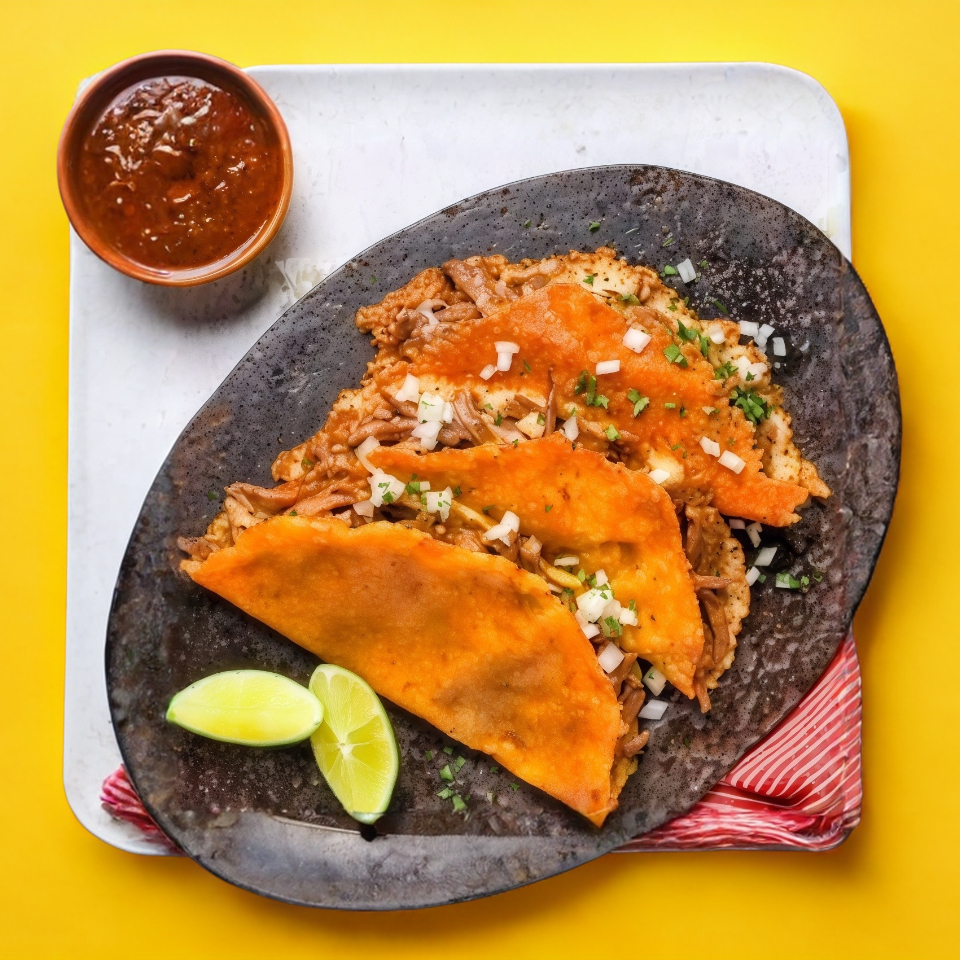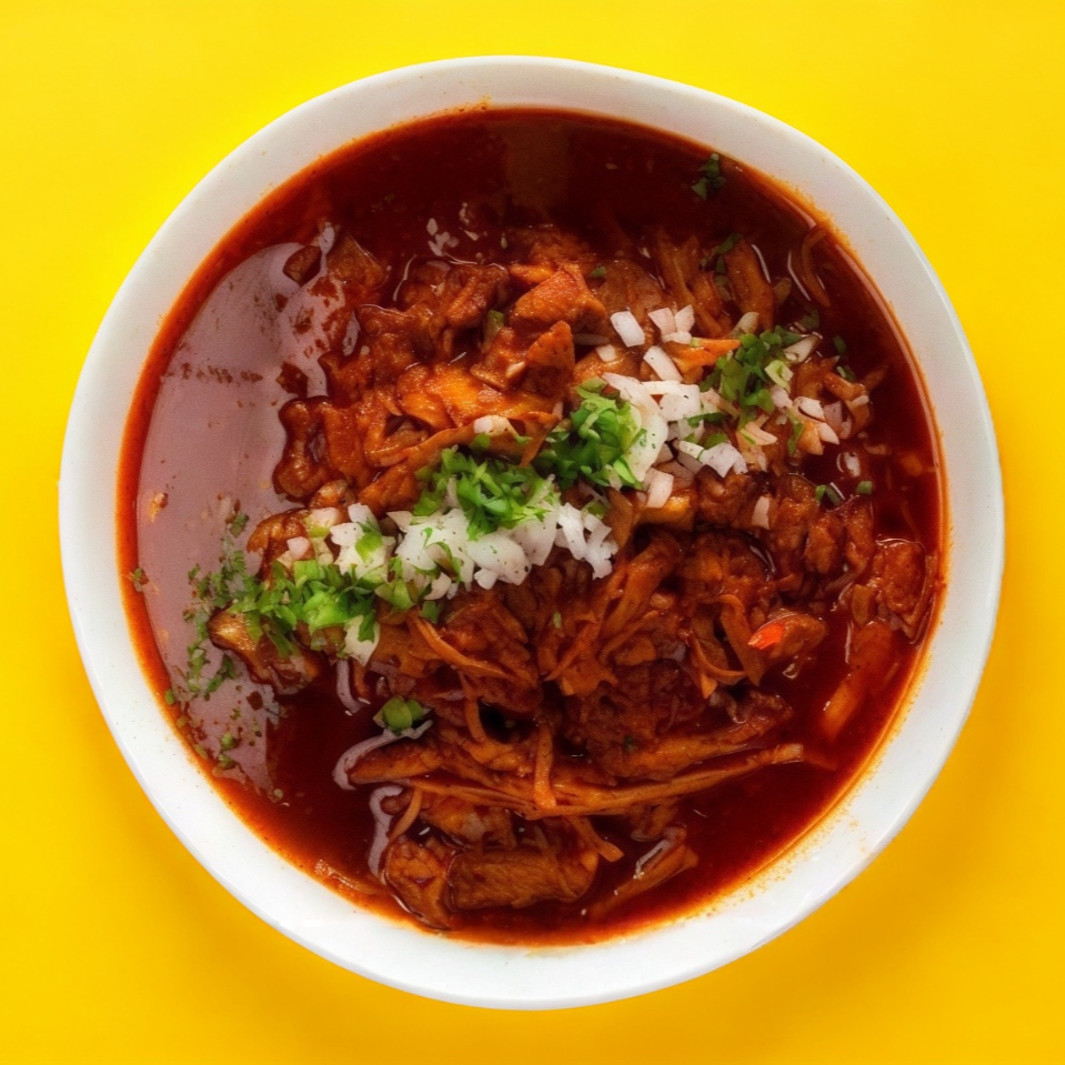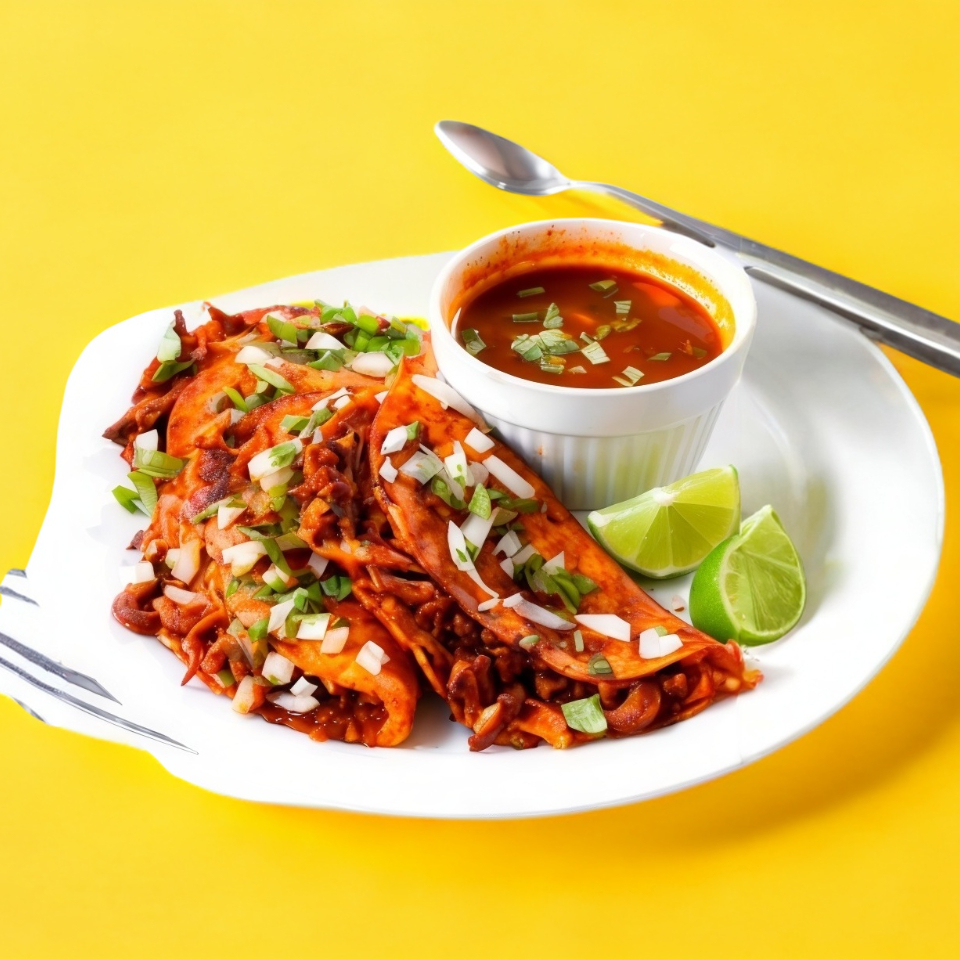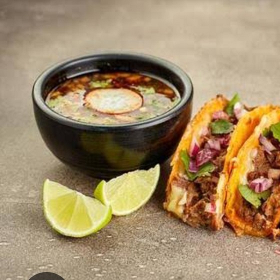Tortilla de maiz , birria, consomé, cilantro, cebolla, salsa