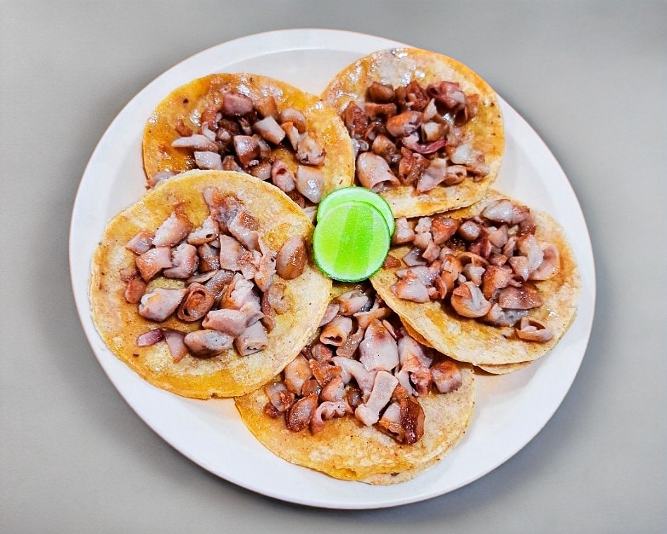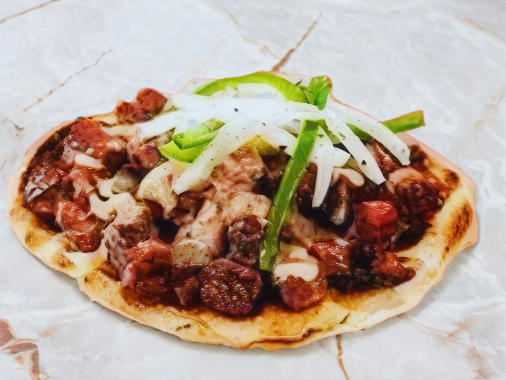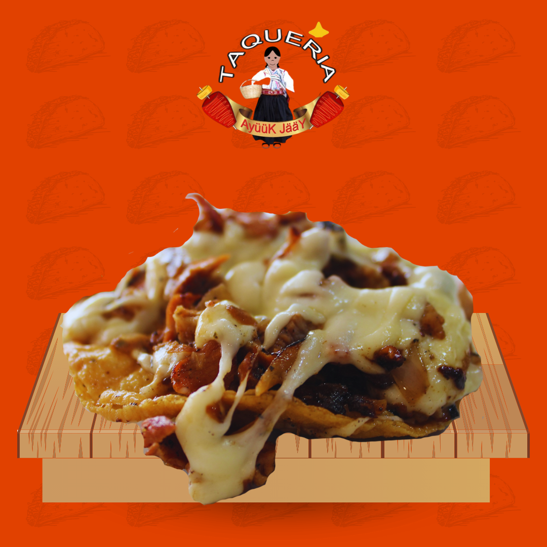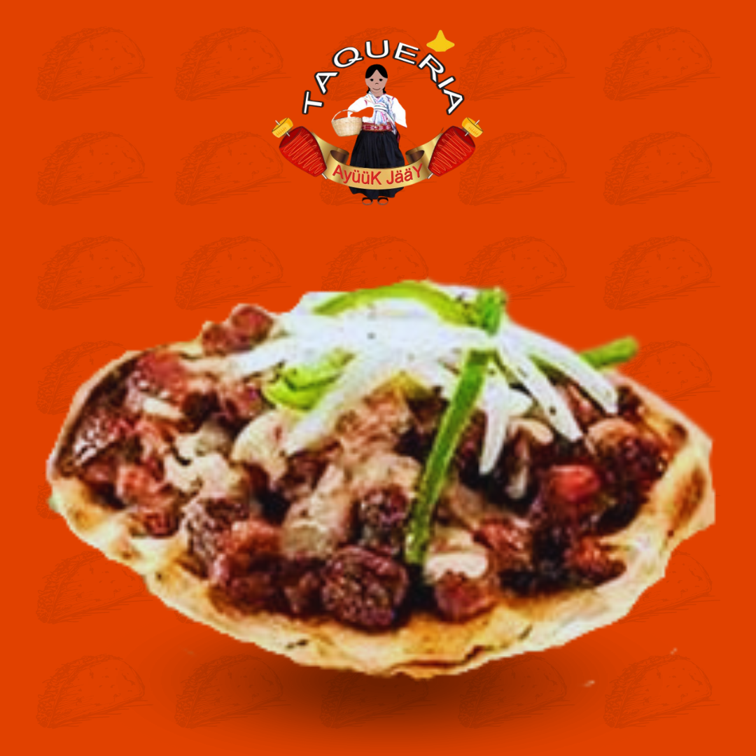 Cebolla, morrón, tocino, pastor, bistec, chorizo, chuleta, arrachera y queso. ( Lleva tortillas de maíz)