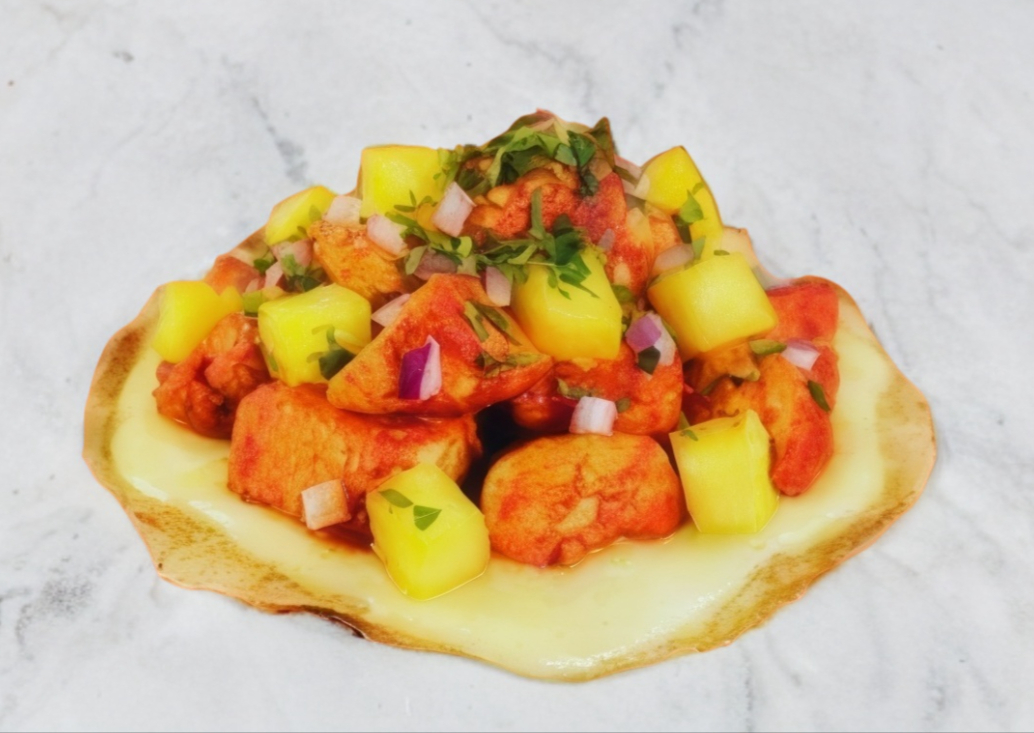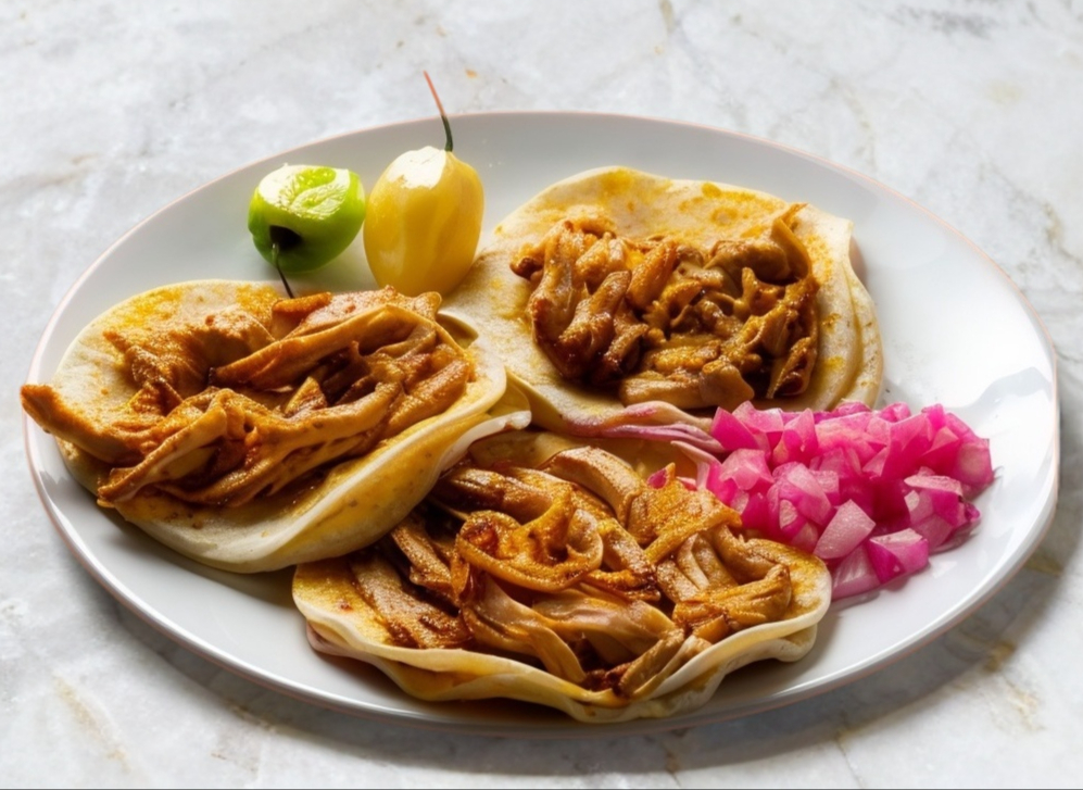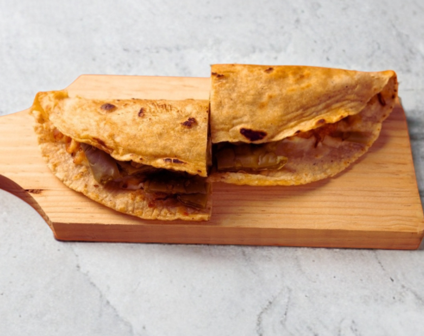 cebolla, morron, tocino, pollo y queso con tortillas de maíz