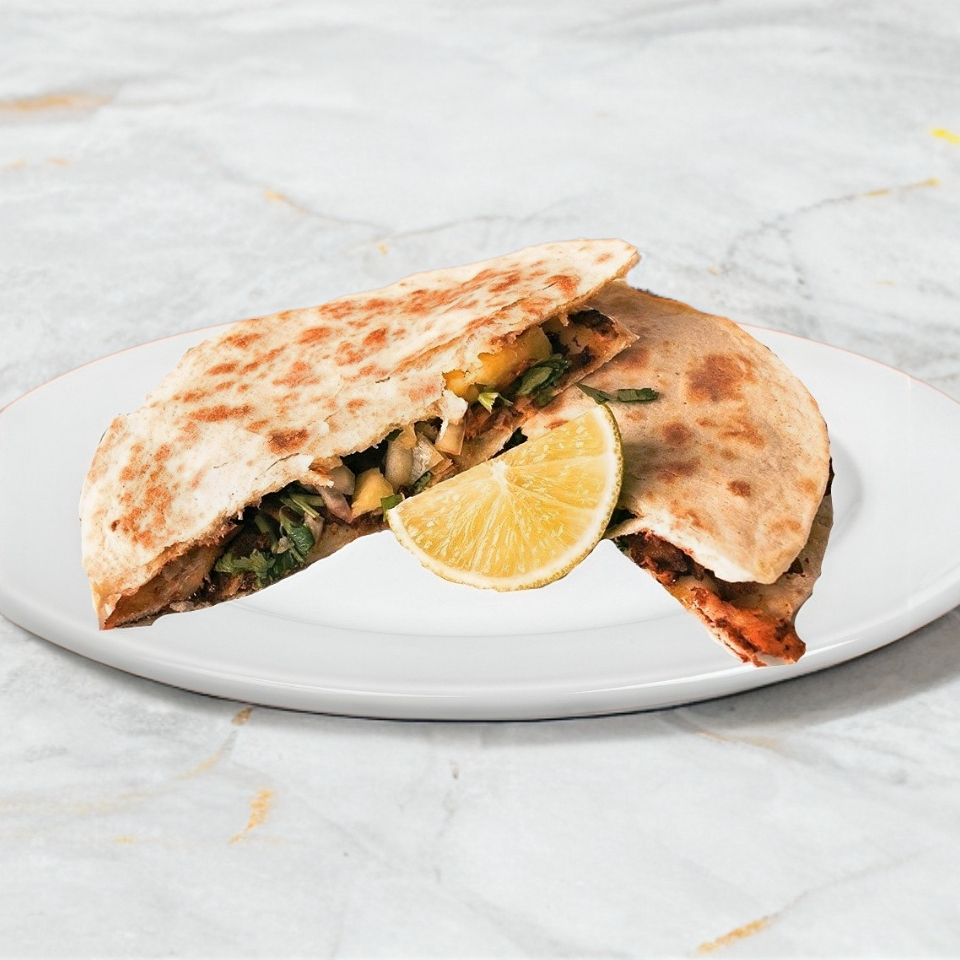 Morrón, pollo, pastor, queso y champiñones con tortillas de harina