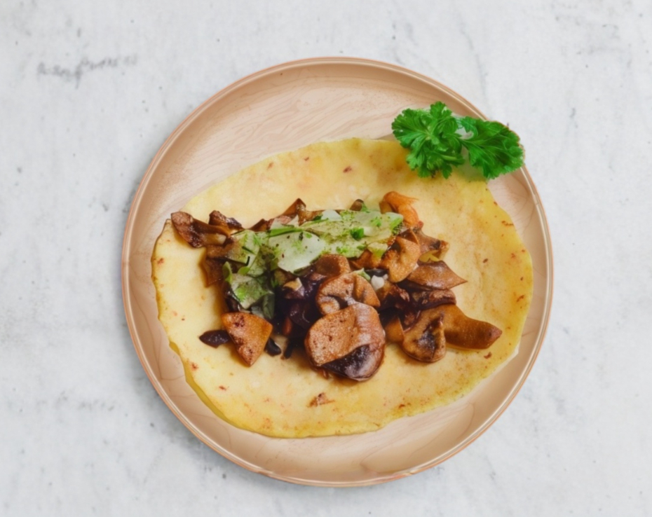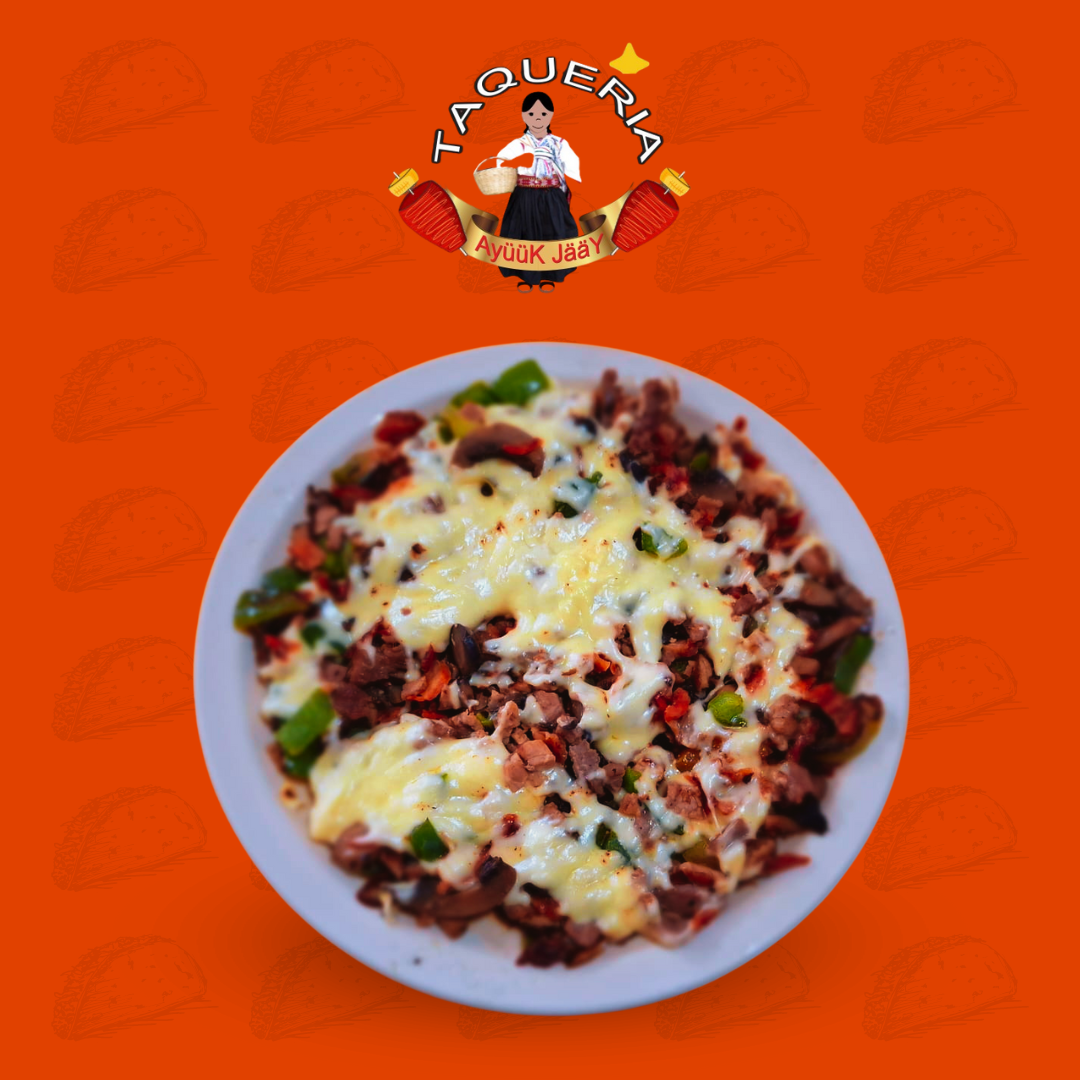 Cebolla, pollo, bistec, queso y champiñones (lleva 5 tortillas de harina)