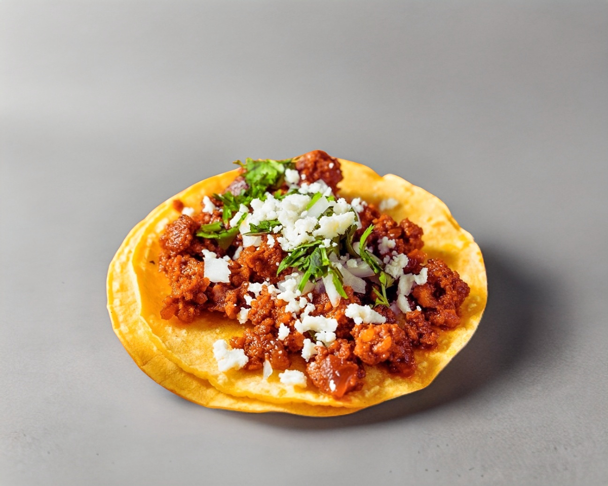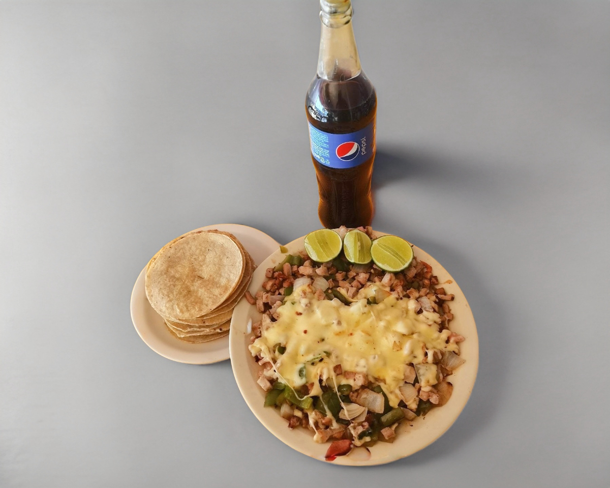 cebolla, morron, tocino, chuleta y queso con tortillas de maíz