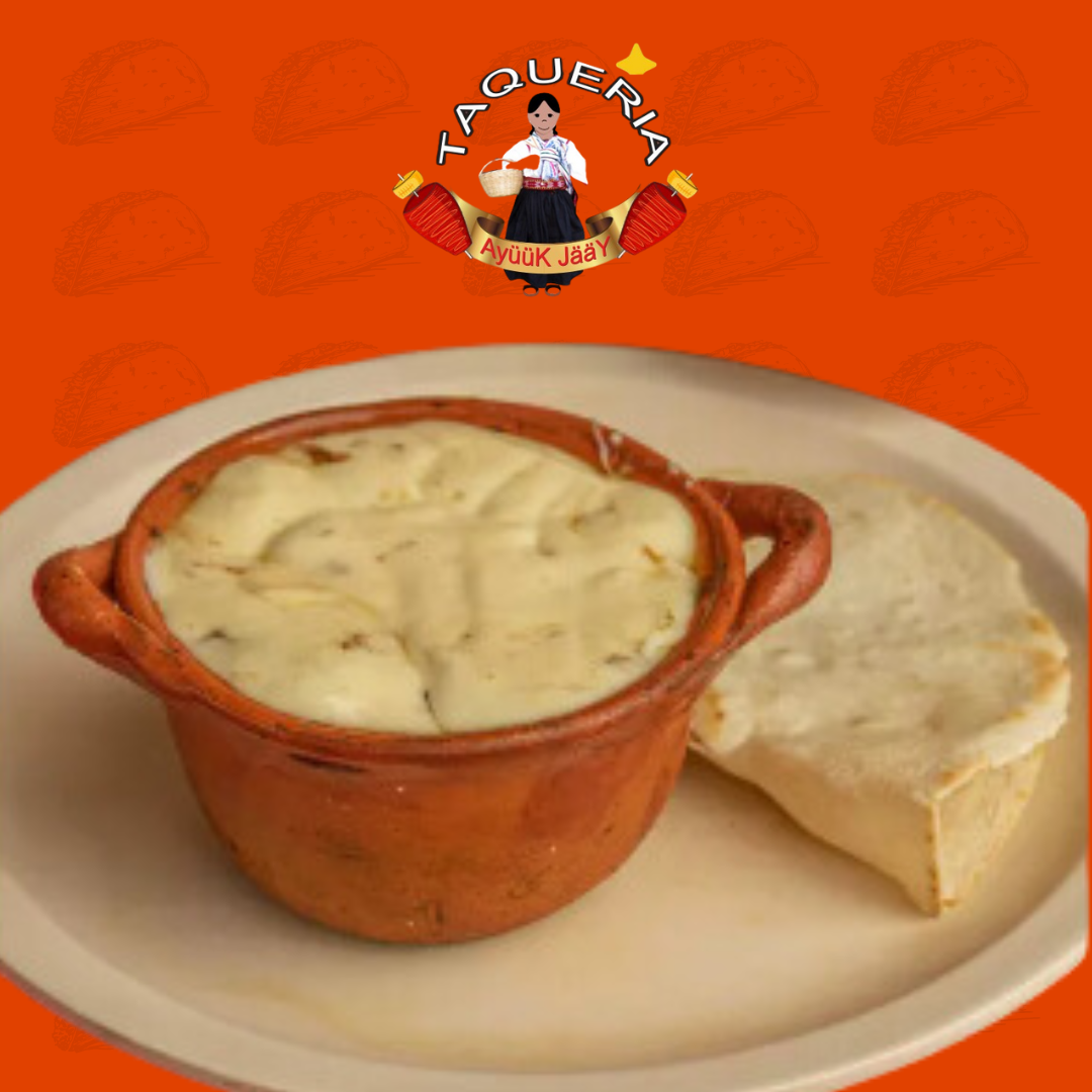 Queso fundido con costilla acompañado con tres tortillas de harina