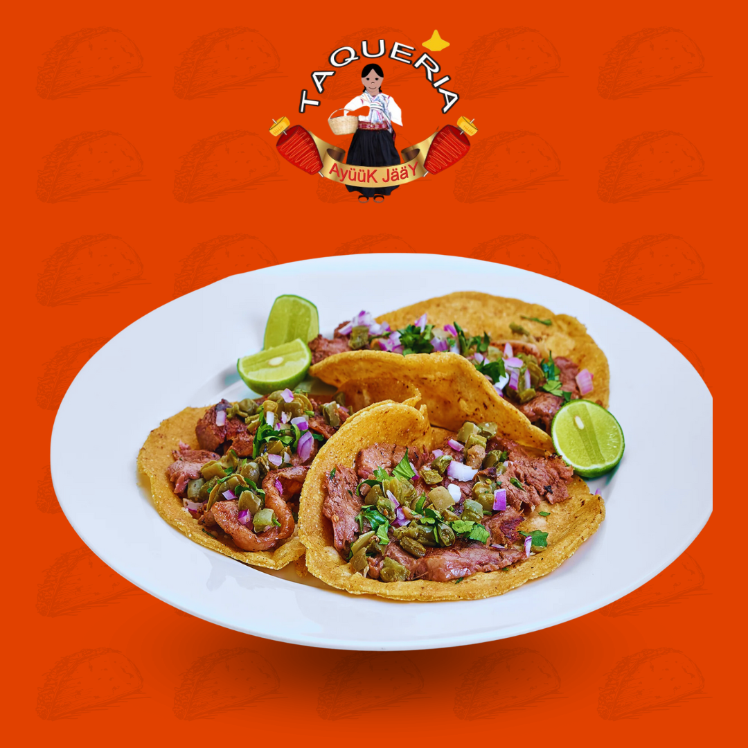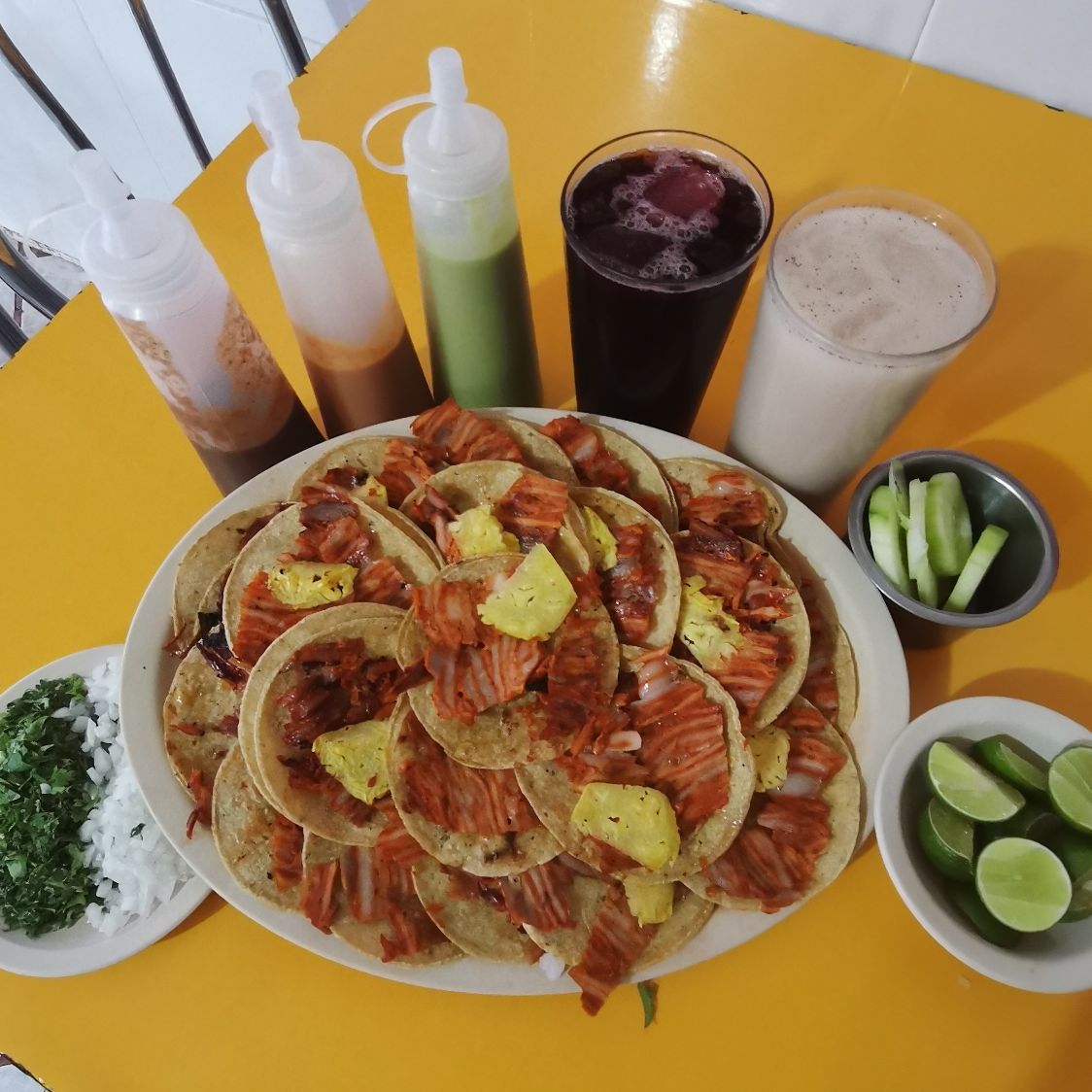 1 Kg de carne de pastor, 1 kg de tortillas, una orden de cebollitas asadas y nopales, salsas y verduras