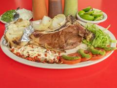 2 tiras de bistec de res asado, queso gratinado, pastor, champiñones, chorizo con queso,ensalada y 1 papa con mantequilla