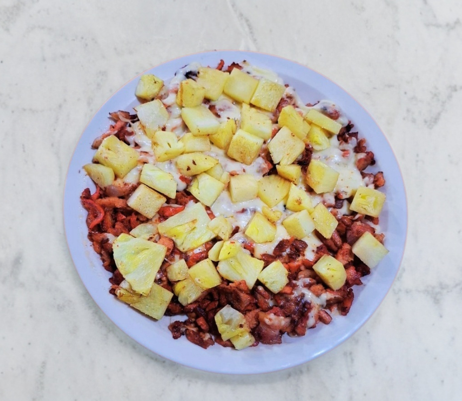 Tocino, queso, piña y carne a elegir (pastor , bistec o chuleta)y tortillas de harina