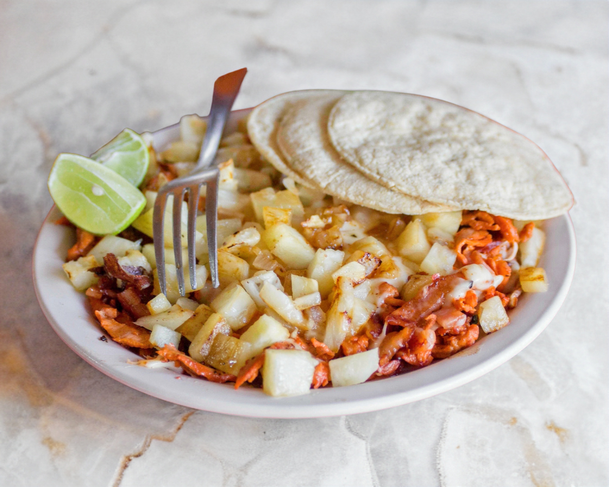 Pastor, piña, tocino, doble tortilla.