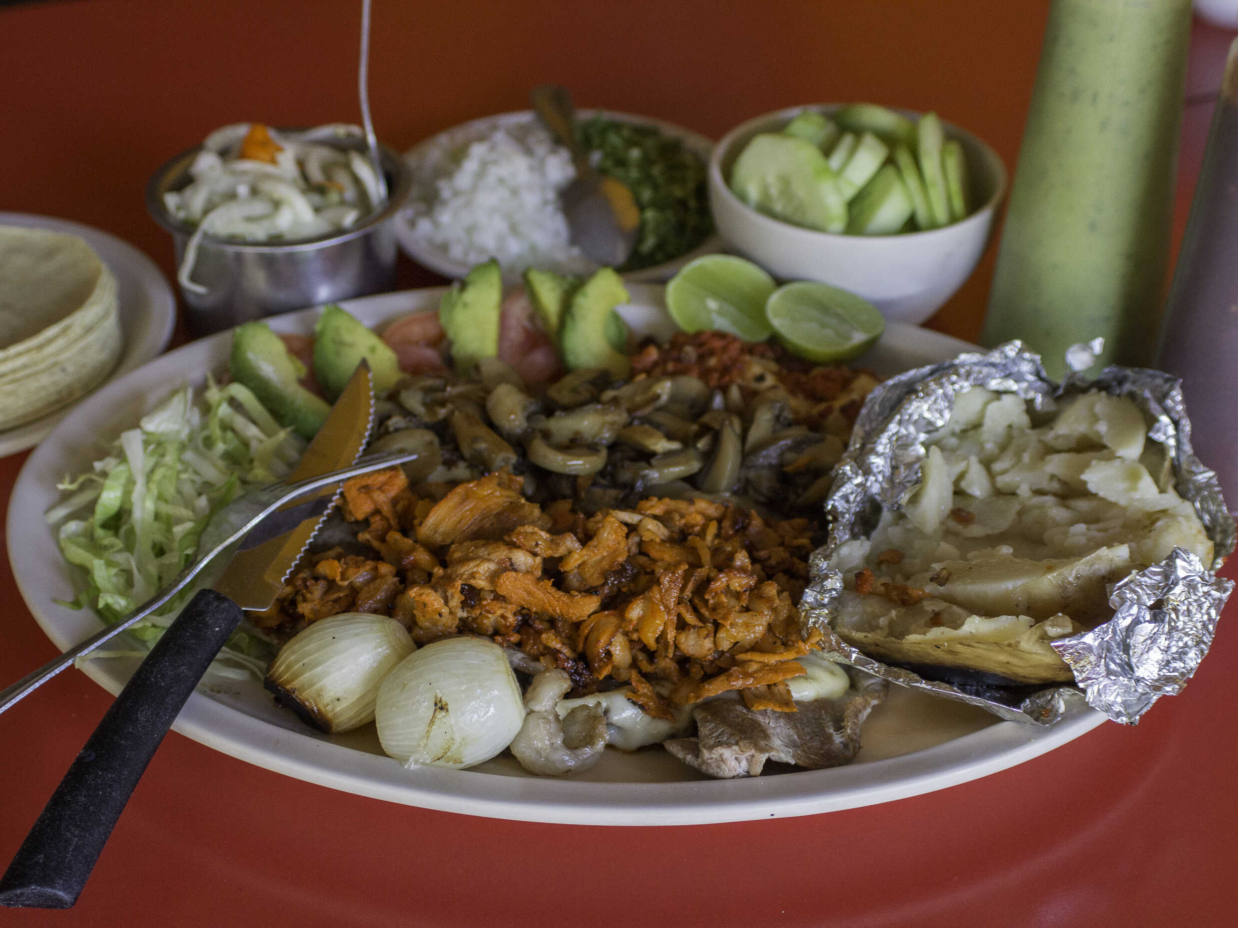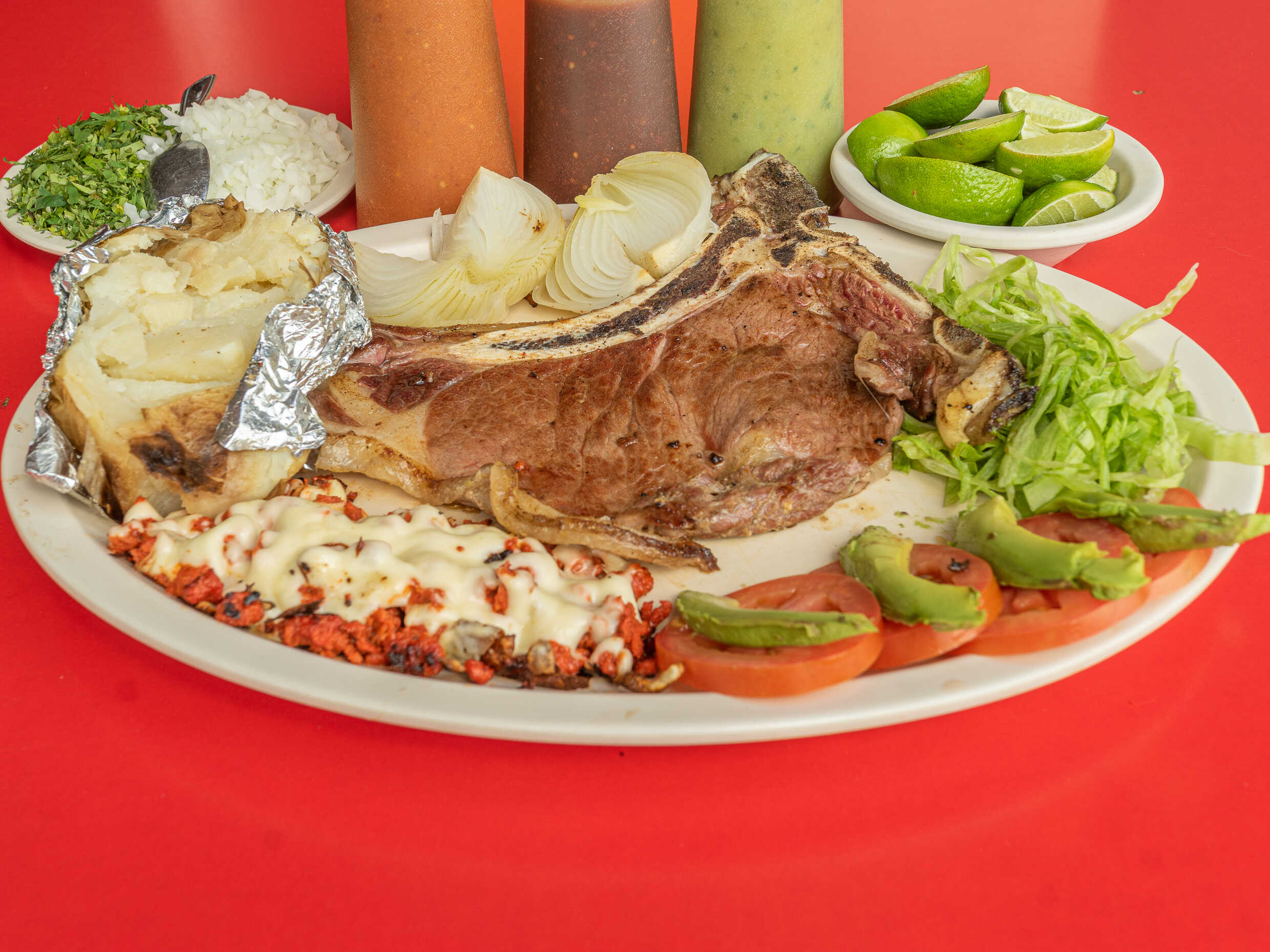 Costilla de res acompañado de ensalada, papá con mantequilla, aguacate, jitomate, tortillas, salsas y guarniciones.