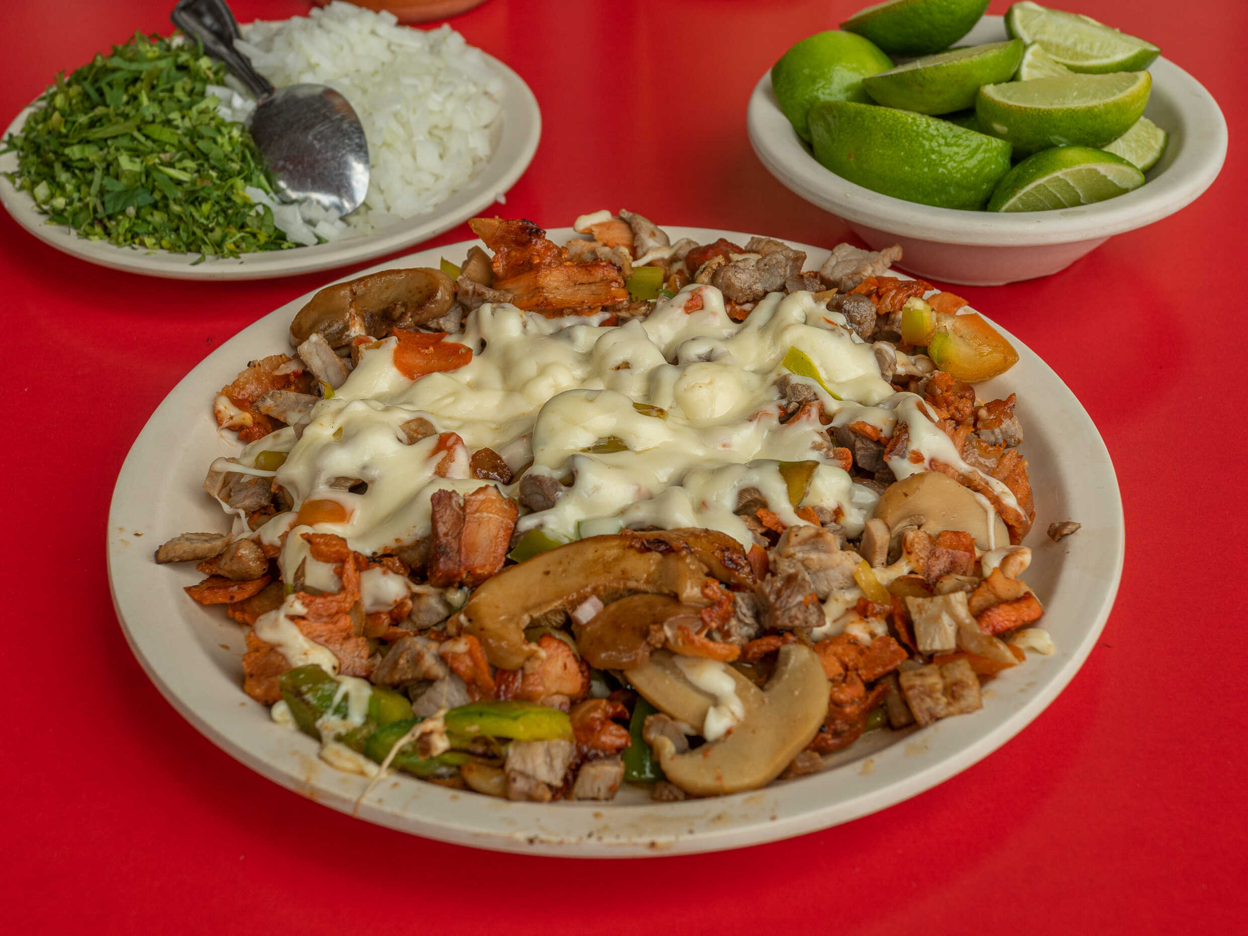 Morrón, chuleta, arrachera, pastor, champiñones y queso.