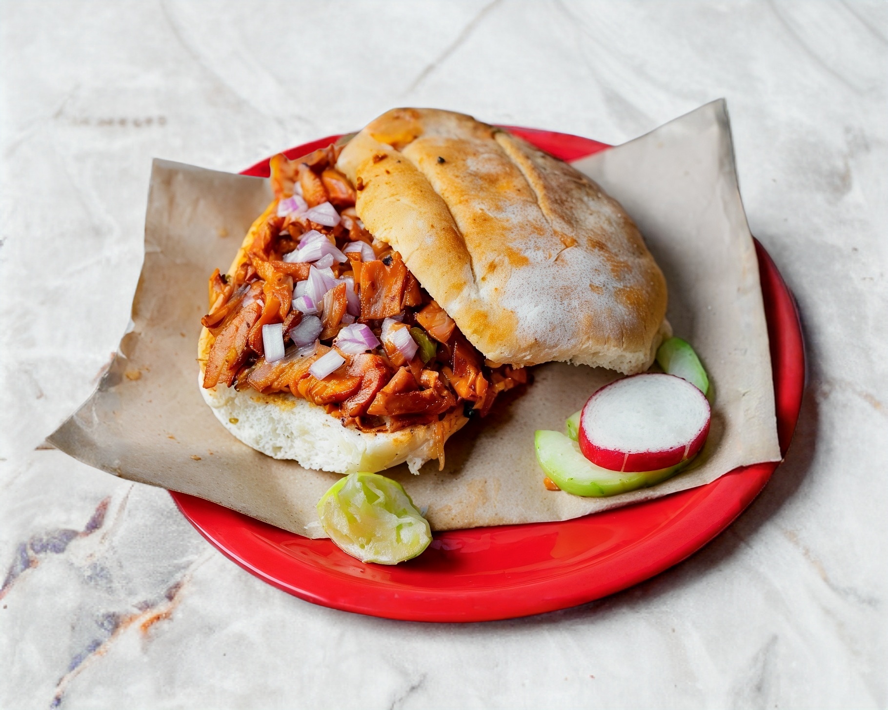 Pan pita, costilla de res y queso oaxaca.
