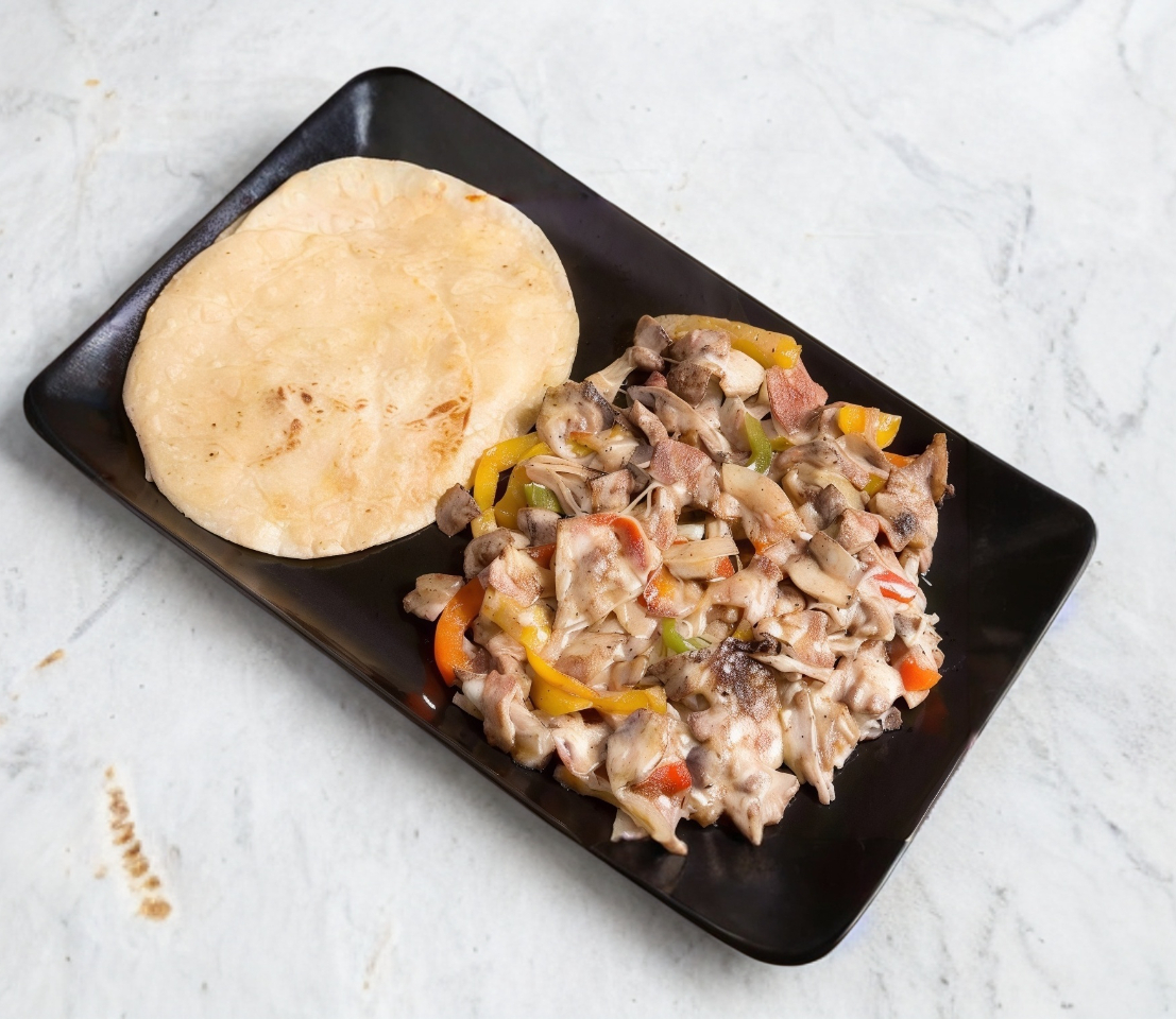 Chuleta, morrón, cebolla, queso oaxaca con 25 tortillas de maíz.