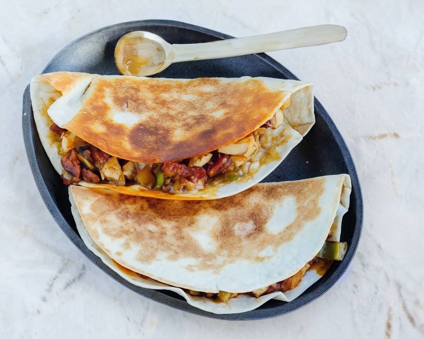 Doble tortilla de harina, chorizo y queso Oaxaca.