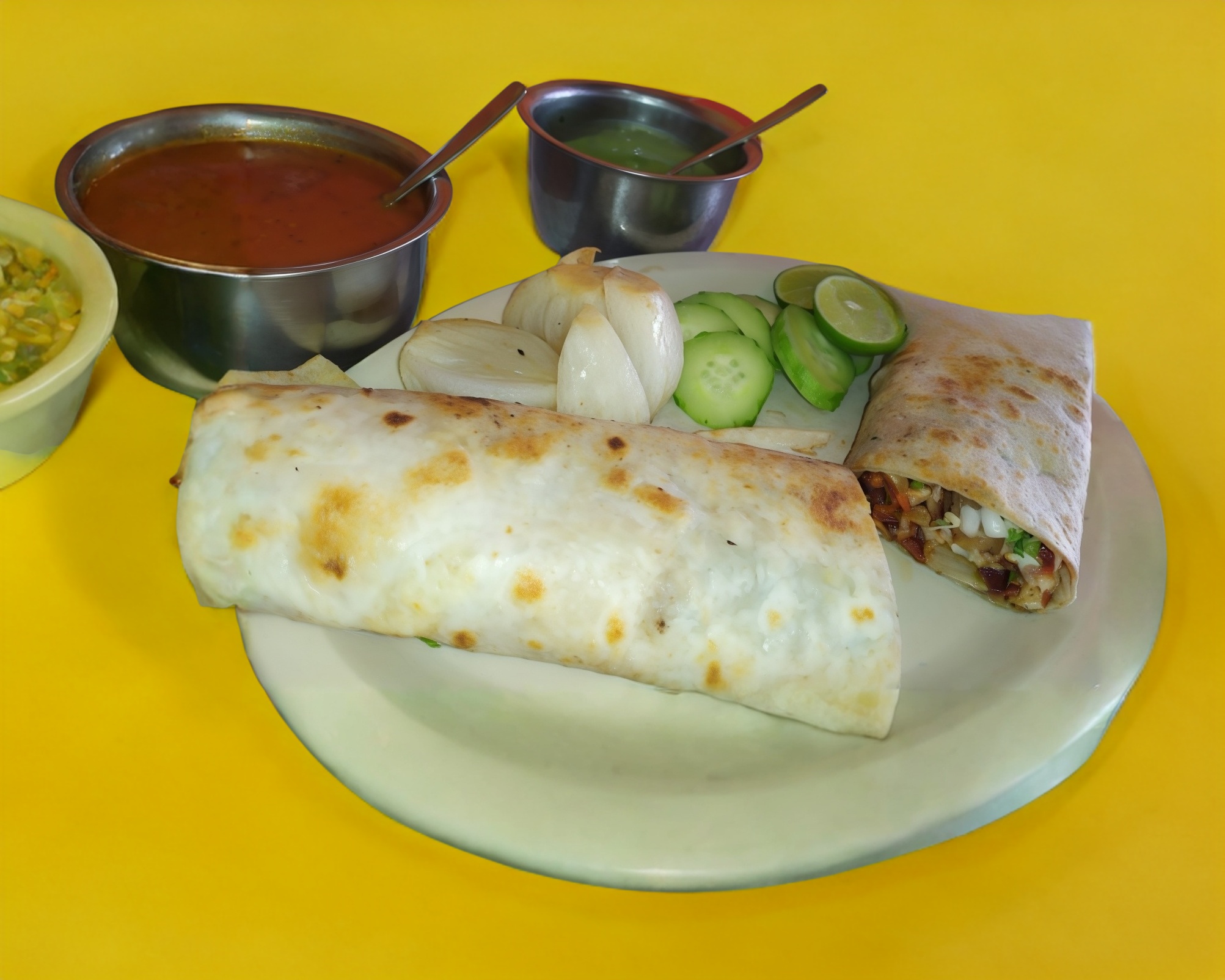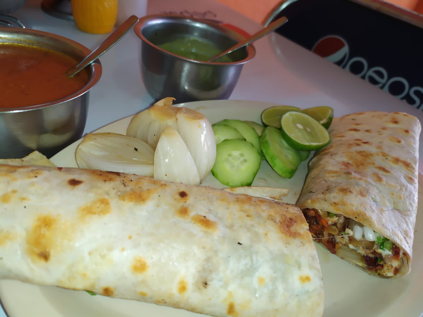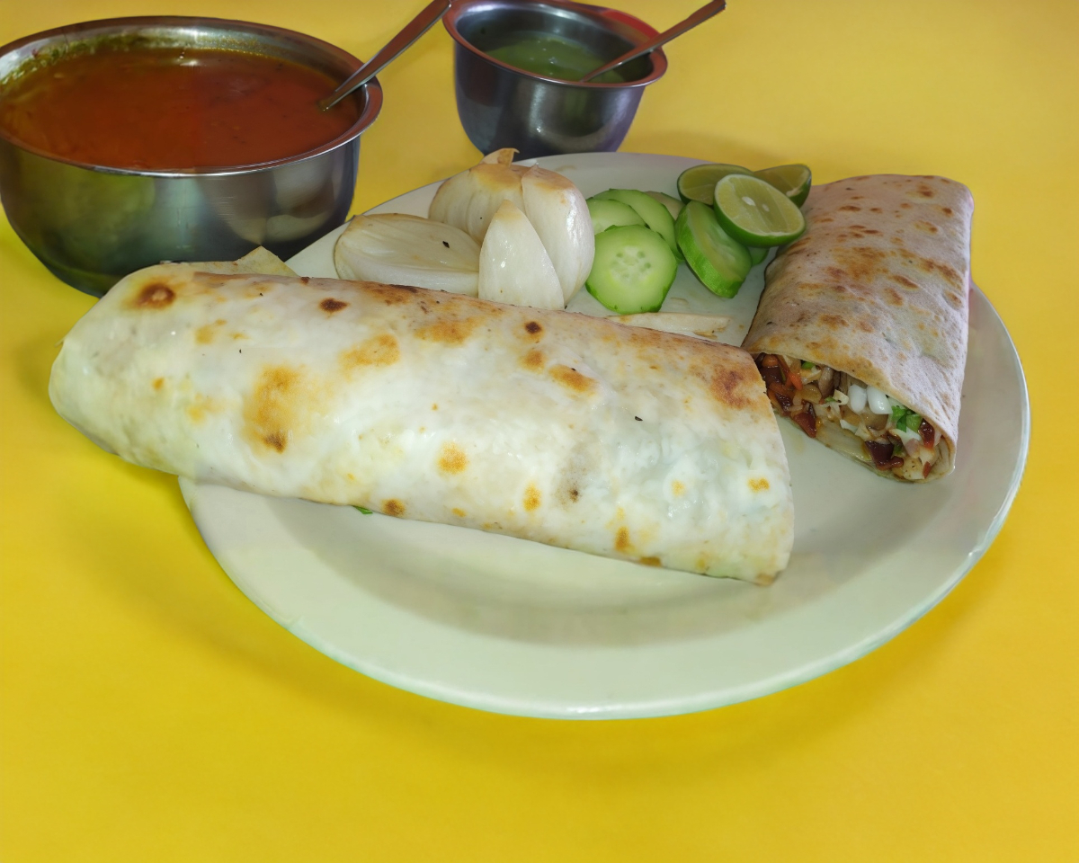Tortilla harina jumbo con aguacate carne y cebolla asada y queso con costra enrrollado