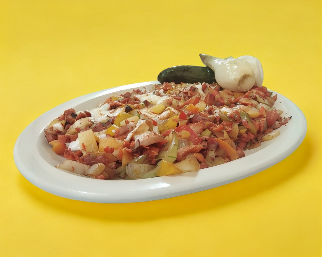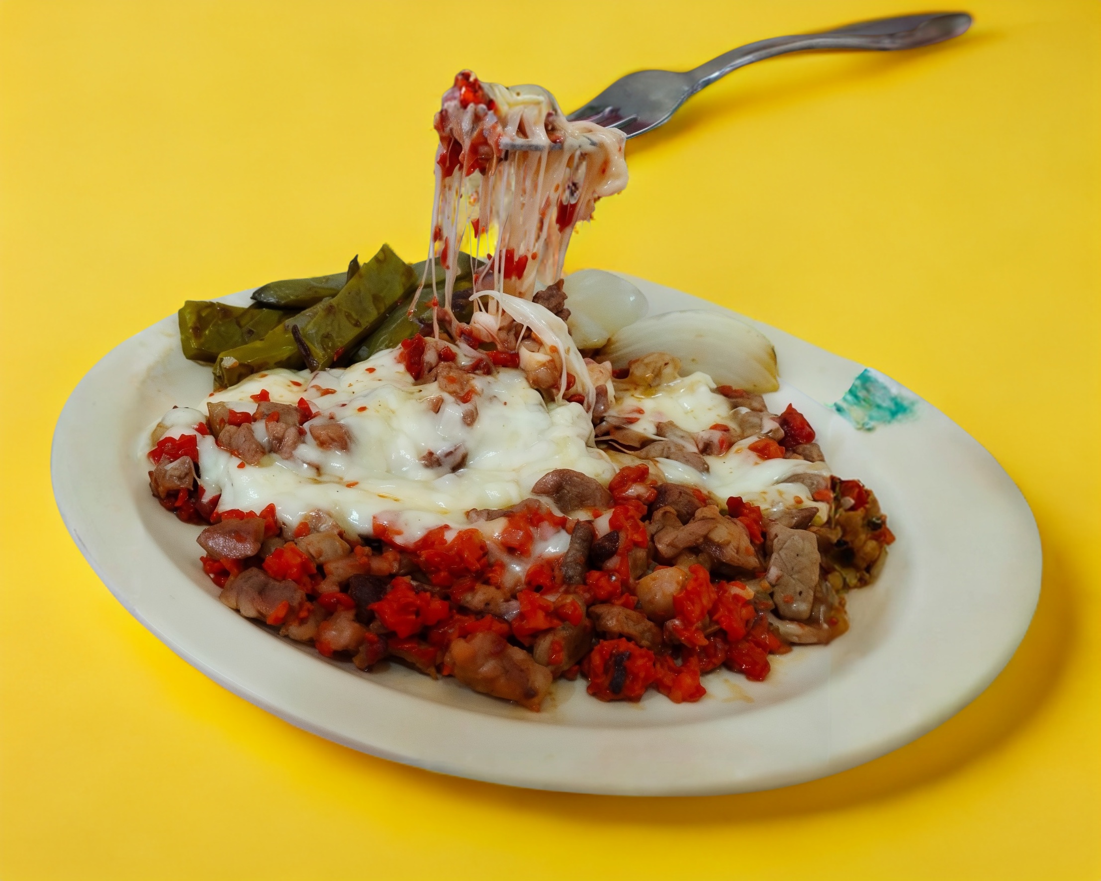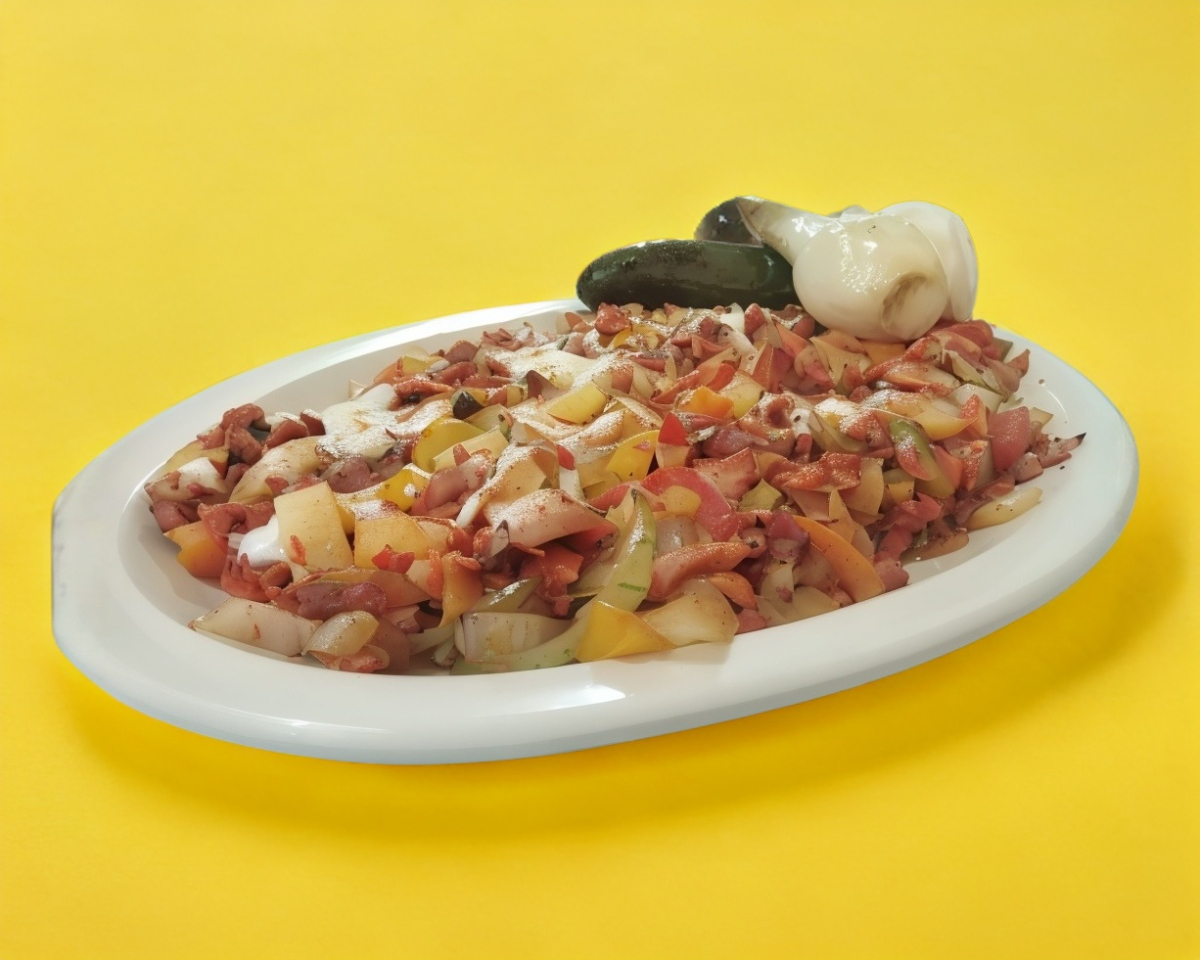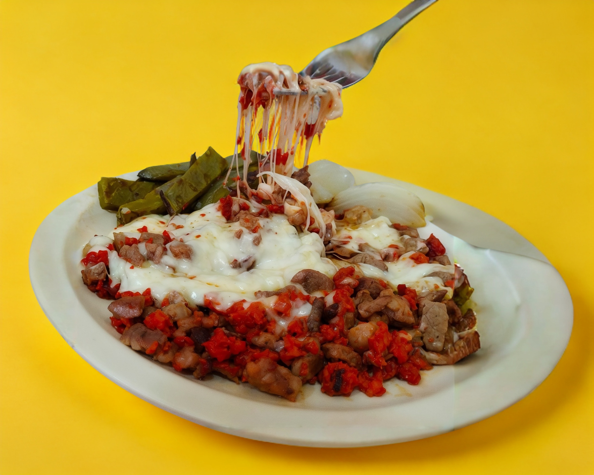 Morrón cebolla tocino bistek de res y queso