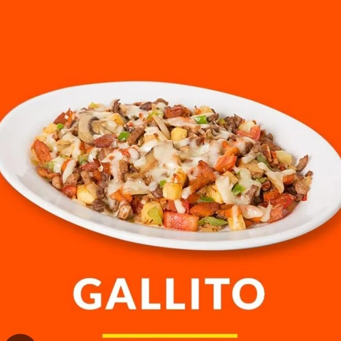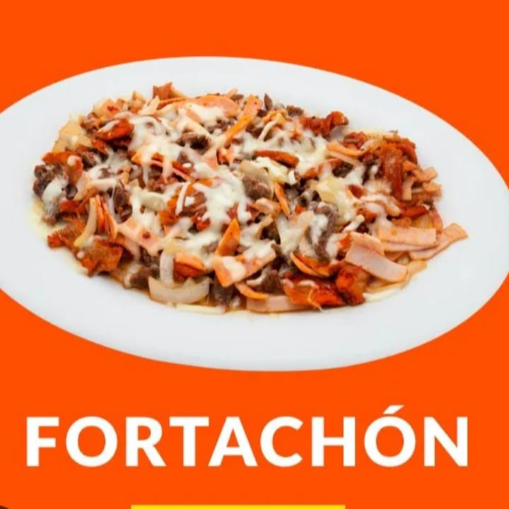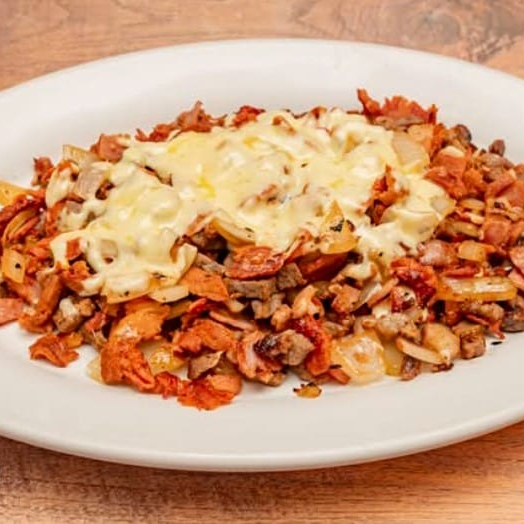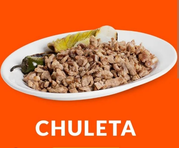 Bistec, chuleta, pastor, cebolla, pimiento morron, champiñones, piña, jitomate y queso.