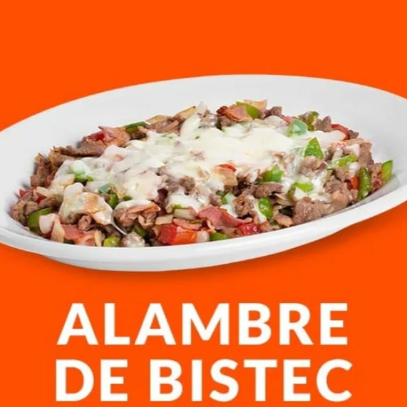 Pastor, bistec, pimiento morron, cebolla, piña y queso.