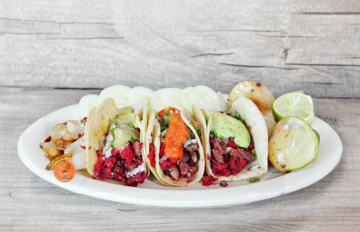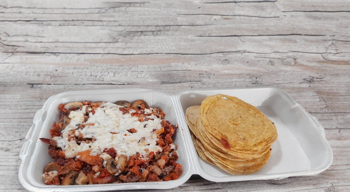 Incluye salsa roja, guacamole, cebollitas, nopales, piña, verdura, tortillas