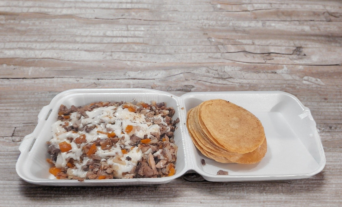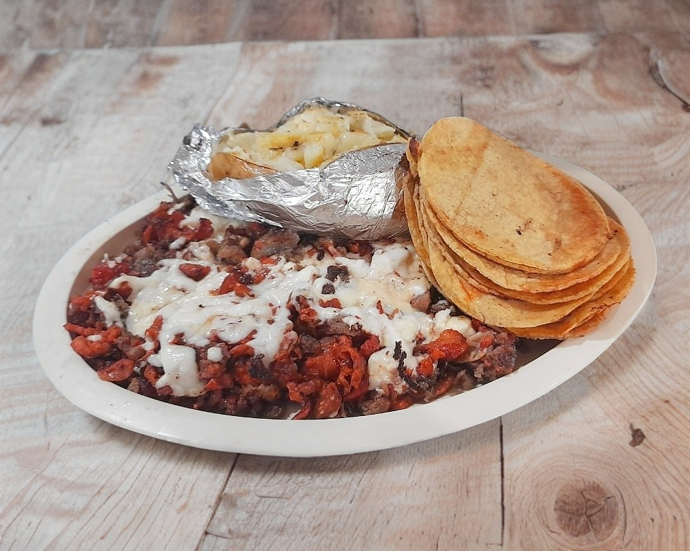 Carne, tortillas para 8 tacos, queso y papa asada.