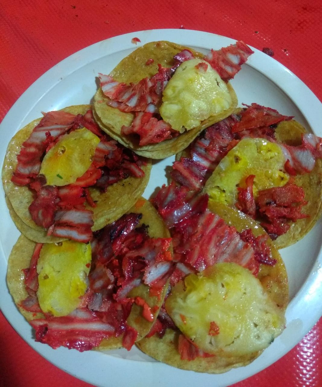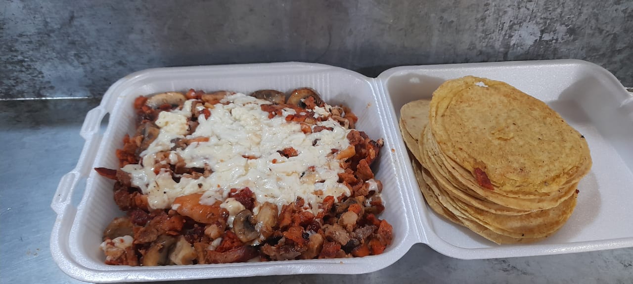 Pastor, chuleta, champiñones, queso y tortillas para 14 tacos.