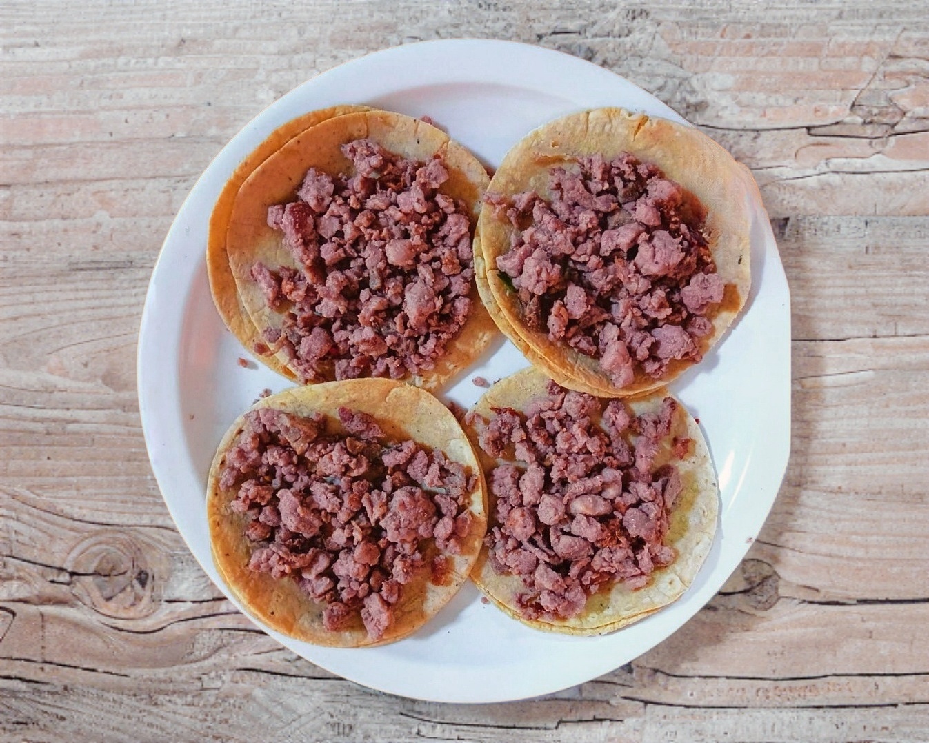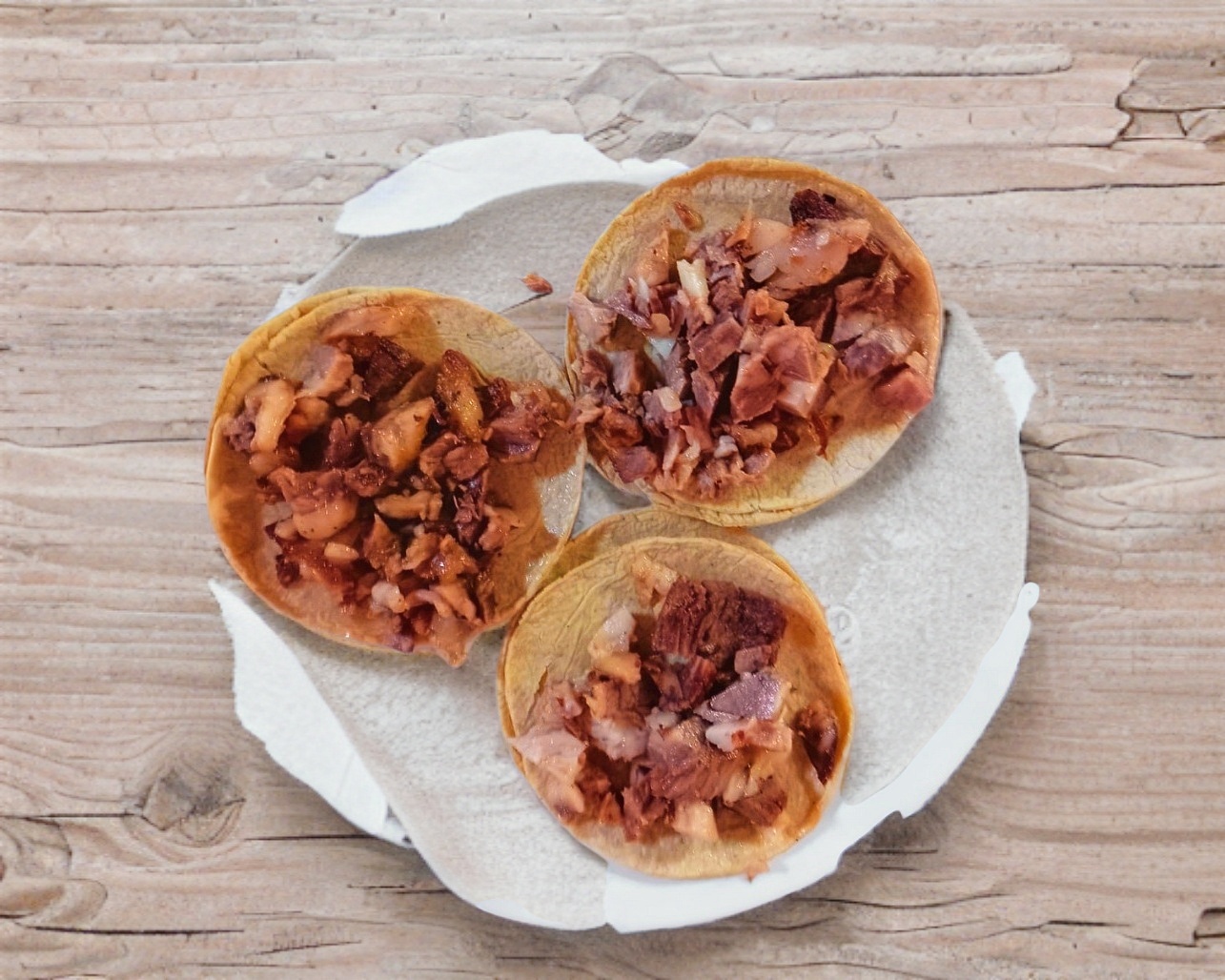 Doble tortilla de maíz, suadero de res, cebolla, y cilantro.