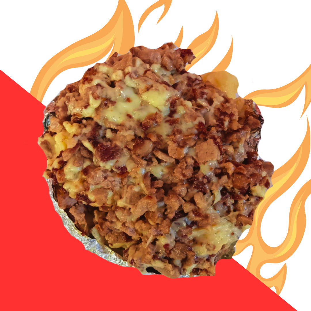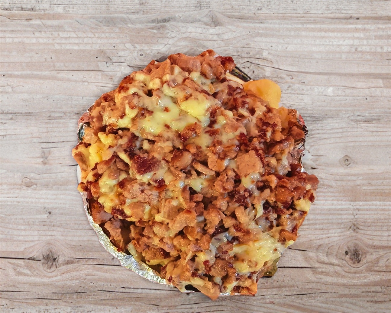 Morrón, cebolla, tocino, carne, queso, y tortilla de maíz.