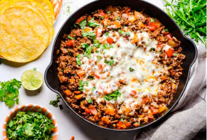 Mantequilla, carne, champiñones, queso, tortilla de maíz.