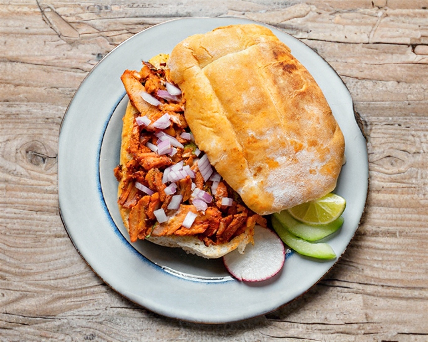 Mantequilla, carne pastor, y queso, tortilla de maíz.