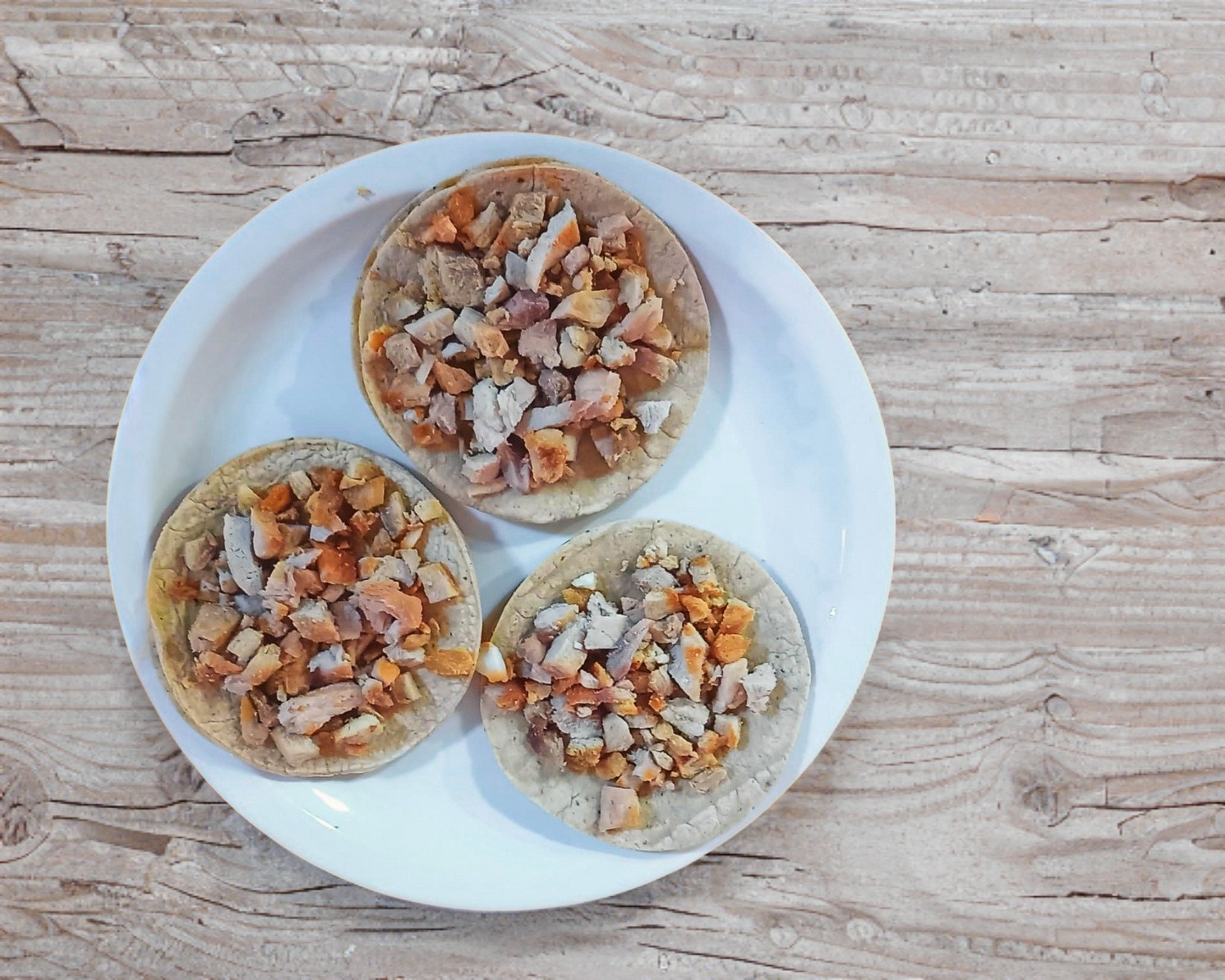 Tortilla, porción de carne, porción de chorizo, cucharada de chicharrones, tortilla y queso.