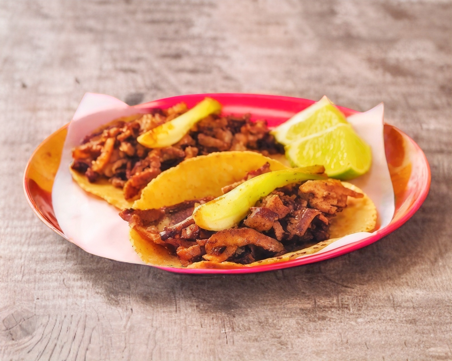 2 Taco de pastor con doble tortilla de maíz, pastor, cebolla y cilantro.