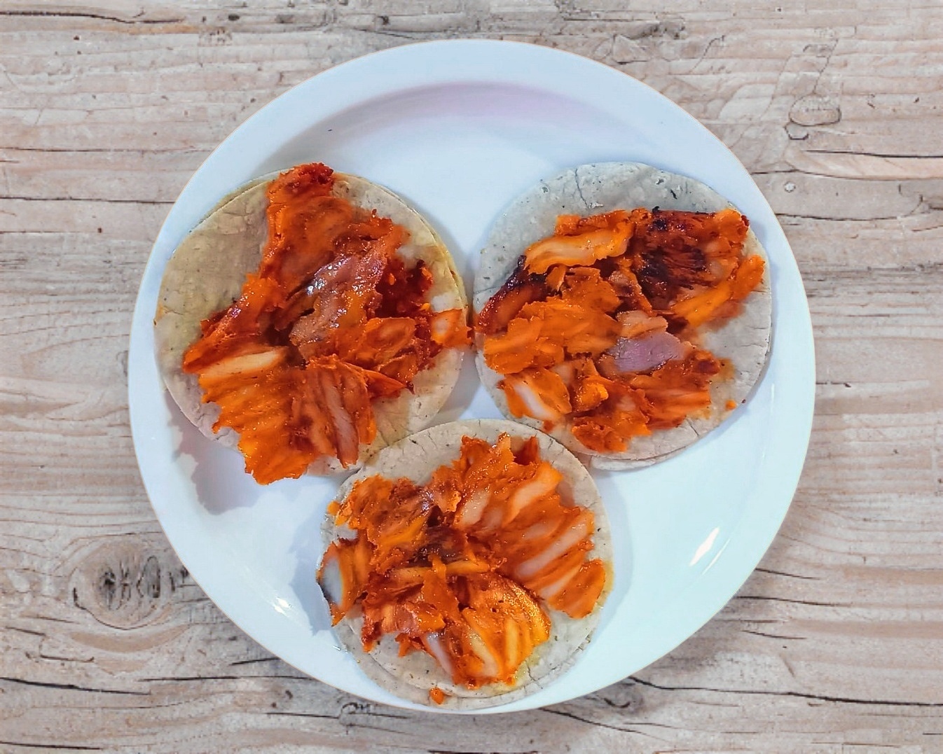 Doble tortilla de maíz, carne de cerdo, cebolla cilantro, y piña.