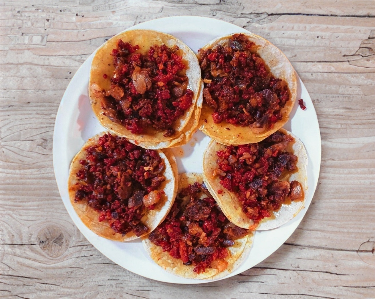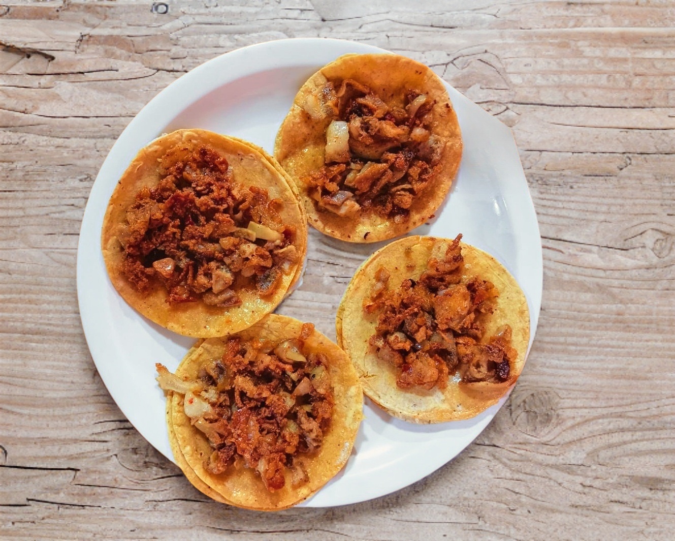 Chorizo, doble tortilla de maíz, cebolla, y cilantro.
