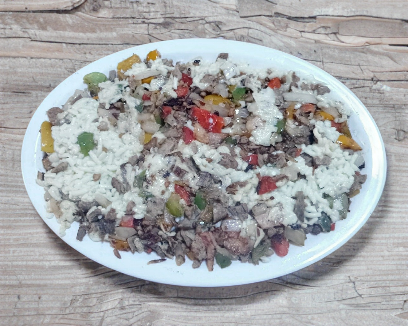 Carne, carne bistec, champiñón, tocino, cebolla, queso.