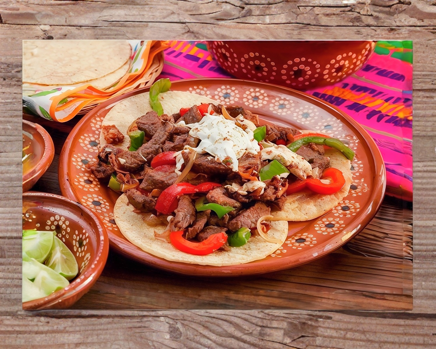 Morrón, arrachera, cebolla, tocino, queso, y tortilla de maíz.