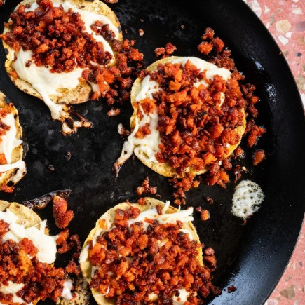 Tortillas tostadas con queso fundido y carne a elegir.