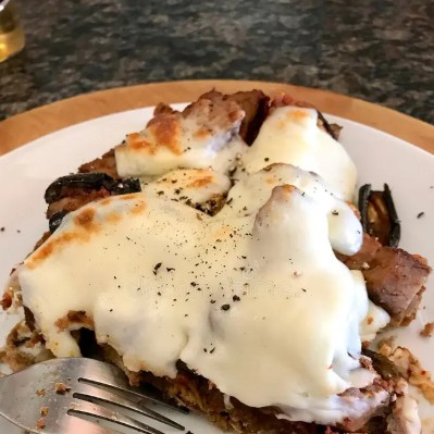 Porción de carne con queso fundido.