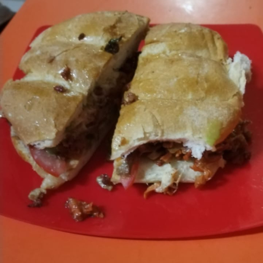 Telera rellena con la carne de su preferencia, servida con ingredientes tradicionales.